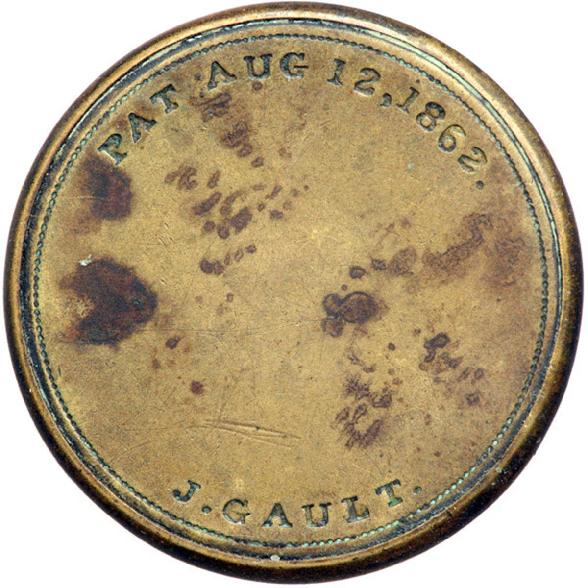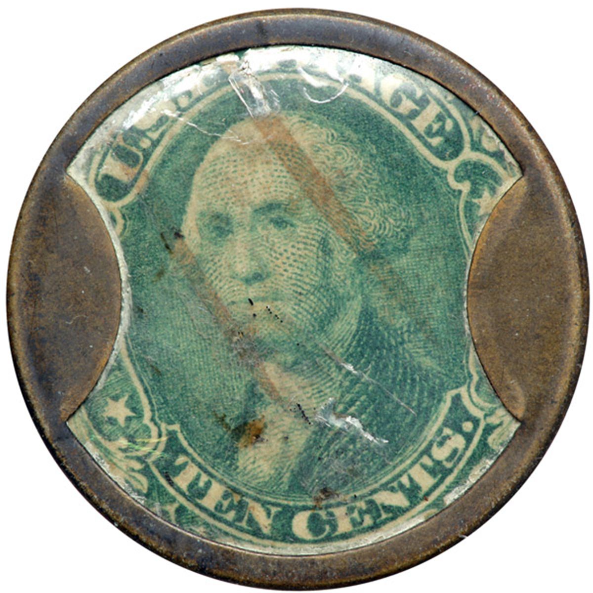 "J. GAULT" EP-116, HB-133, S-97, 10¢ Plain frame. . Fr-EP-116. Some mottled coloring appears on the case of this piece, which is mostly medium brown with darker areas on the reverse. The mica is about 30% crazed, mostly at the lower left third, and the stamp is decent but has an apparent pen cancellation or faded ink mark on the face. An interesting piece that is worthy of consideration if you want just one affordable piece of this issue or denomination. Very Fine.