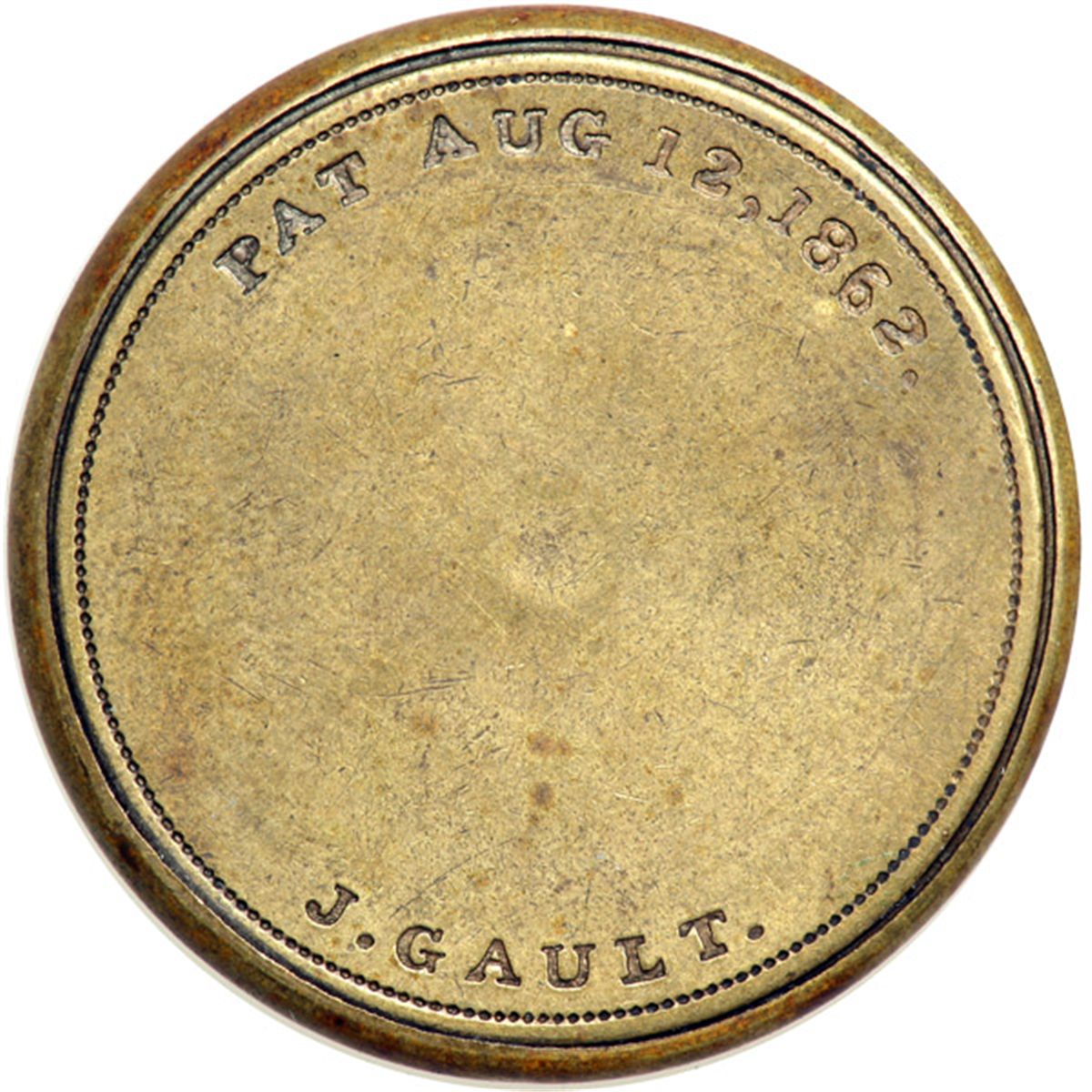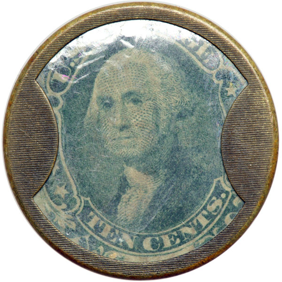 "J. GAULT" EP-117, HB-134, S-97a, 10¢ Ribbed frame. . Fr-EP-117. This is the much scarcer Ribbed Frame variety. The outer edge of the encasement has a lovely olive toning, with the back an even medium brown across the entire surface. The mica is completely intact, with a couple of small areas of crazing, only noticed under magnification. The stamp has faded a bit, however, it is still a pleasing green.