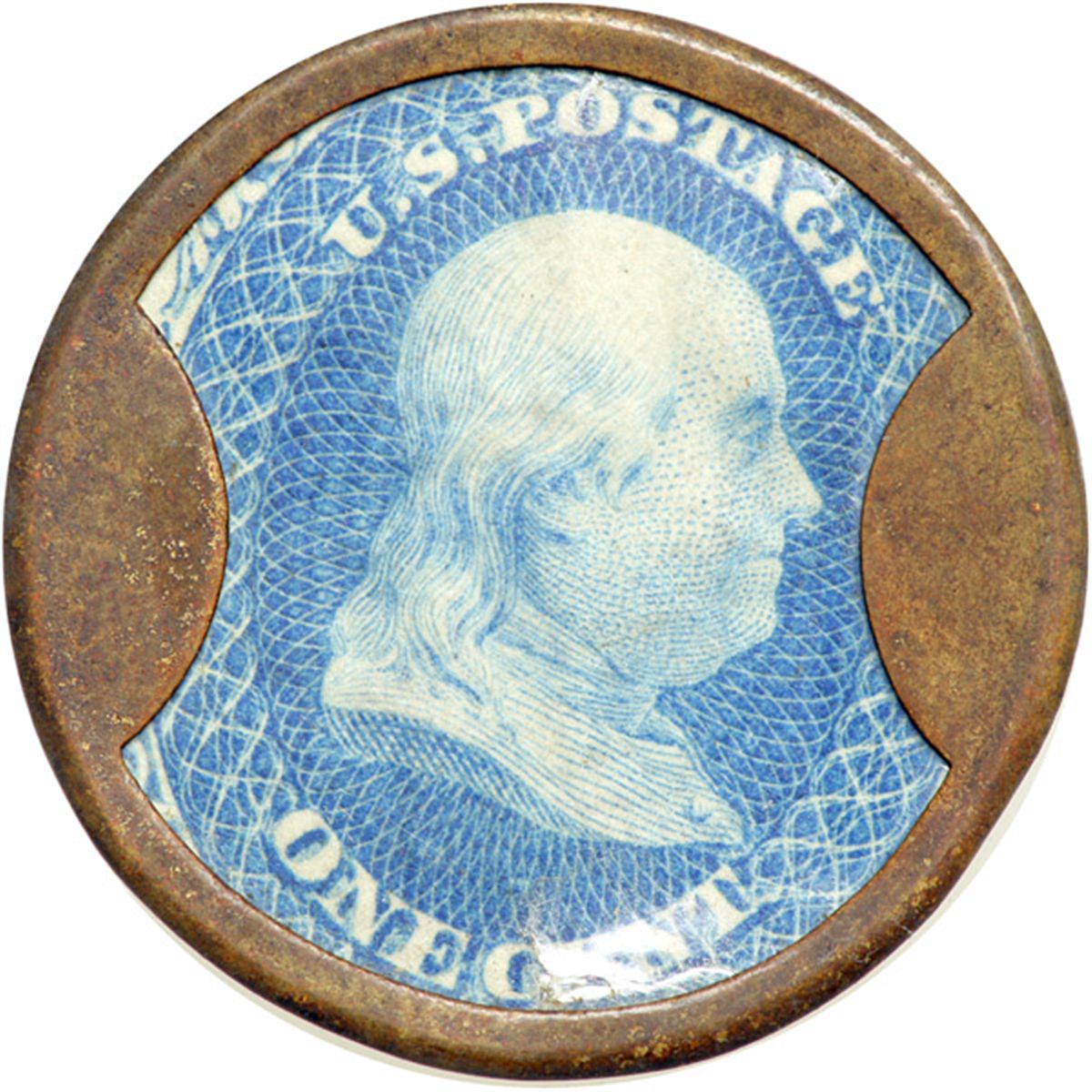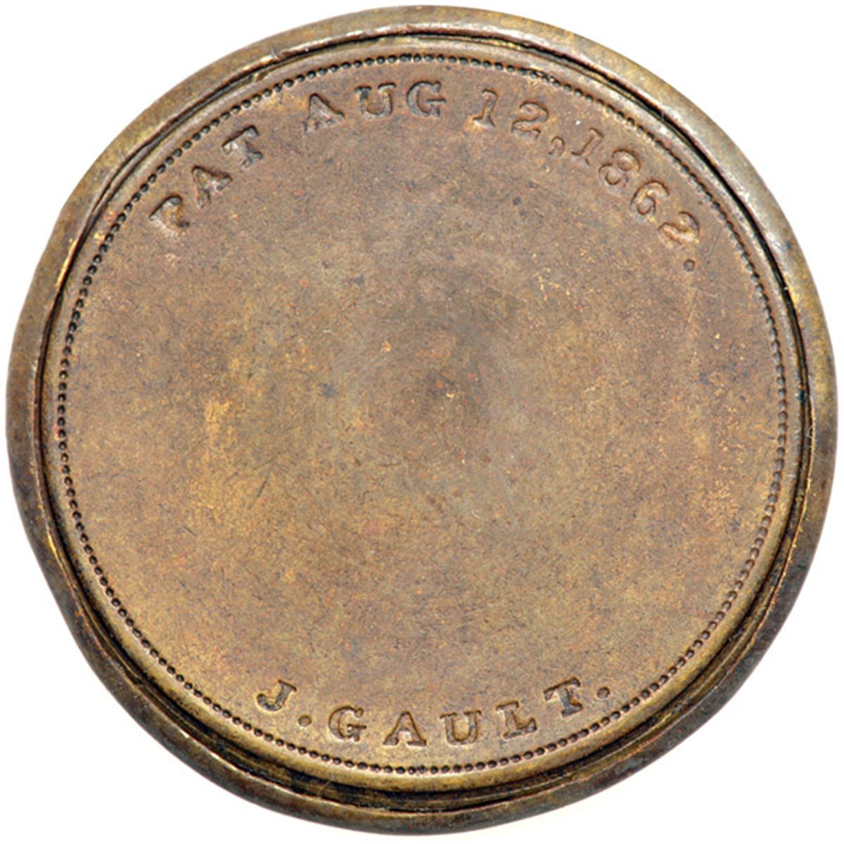 "J. GAULT" EP-16, HB-126, S-93, 1¢ Plain frame. . Fr-EP-16. This is a much scarcer variety, with the Reed reference estimating it as R7 with between 11 and 15 pieces surviving. The stamp is bright blue and the mica is nearly completely clear, with only the faintest hints of crazing at the edges. The case is an even light brown color; it shows some minor tooling inside the rim at the base of the reverse, indicating that the stamp was either replaced or the case was improperly assembled. In any case, this is a rare piece that should fill a hole in any advanced collection. Extremely Fine.