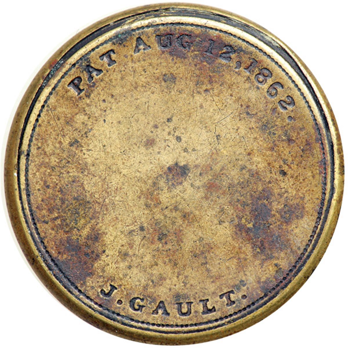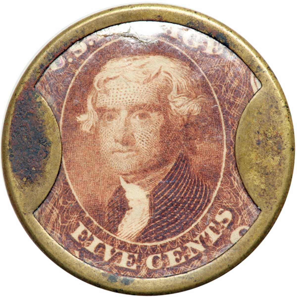 "J. GAULT" EP-78, HB-131, S-96, 5¢ Plain frame. . Fr-EP-78. The case of this Gault piece displays mottled olive and chocolate brown surfaces. The edge reveal and tooling marks at the top of the reverse suggest either a replaced stamp or improper assembly. The stamp itself is remarkably bright and almost perfectly centered. The mica is about 90% clear with only minor crazing and a small crack near the top rim. Actually a very attractive piece despite its flaws. Very Fine. Ex: Bowers & Merena 11/2009:54.