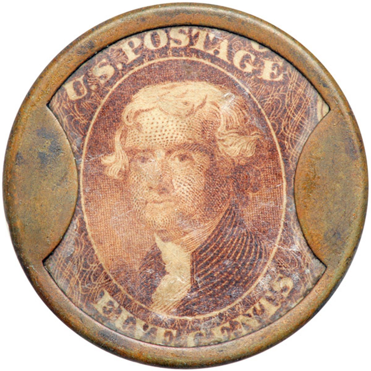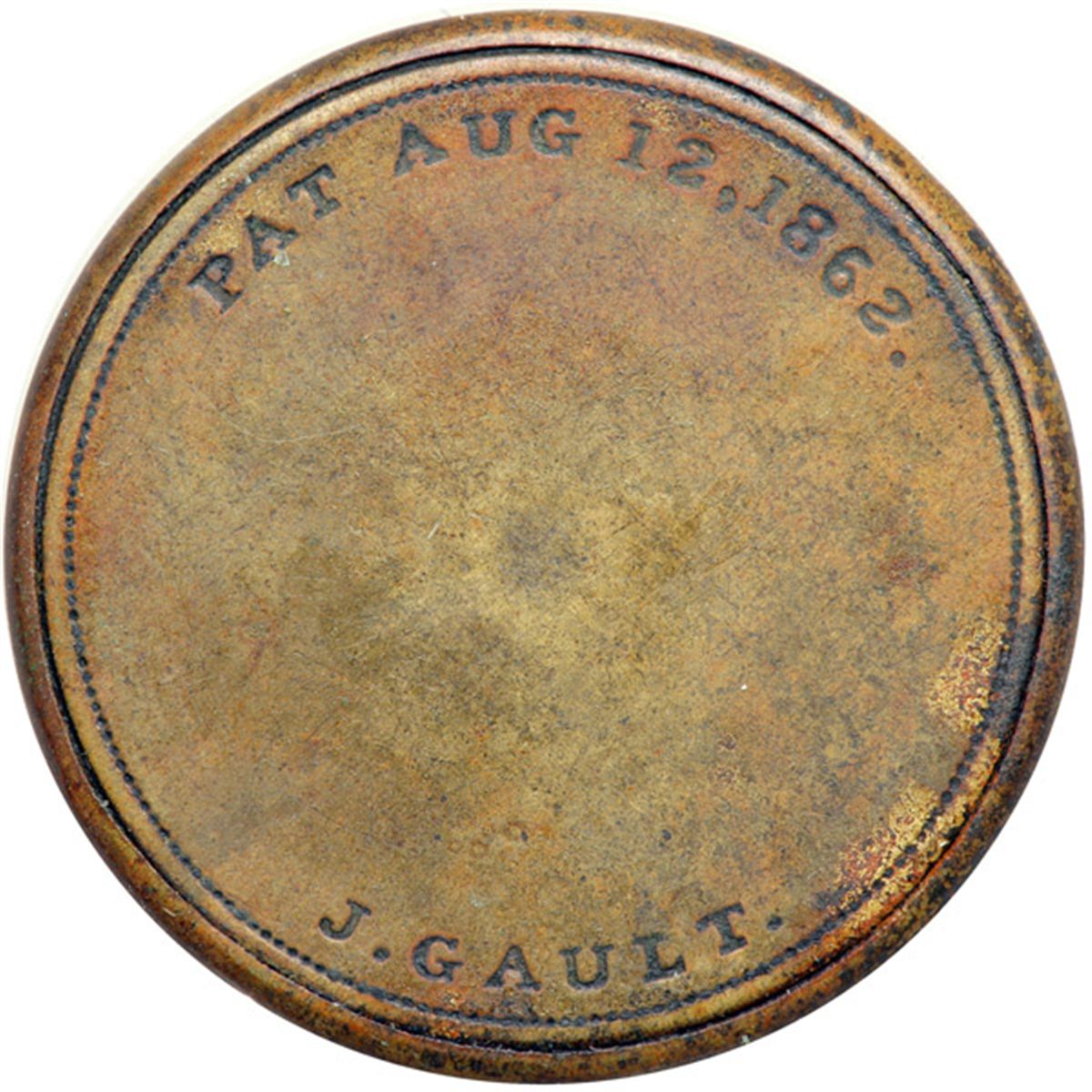 "J. GAULT" EP-78, HB-131, S-96, 5¢ Plain frame. . Fr-EP-78. The five cent plain frame is the second most common of all the Gault pieces. This example is quite attractive, with a smooth brown case that is original and unopened. The bottom half of the mica is crazed, but the clarity isn't all that bad. The stamp is well centered and bright. Very Fine. Ex: Early American History Auctions 10/1998:453.