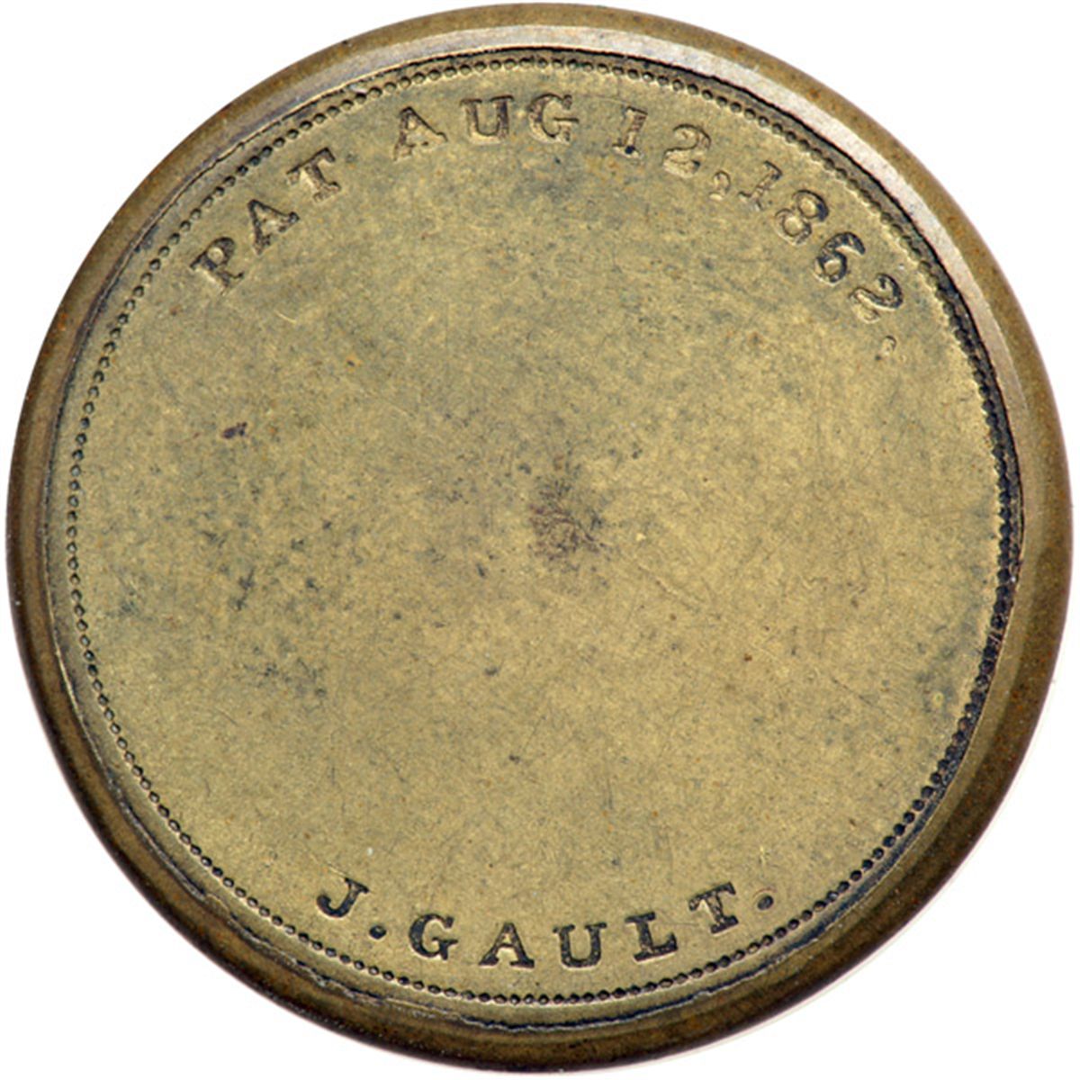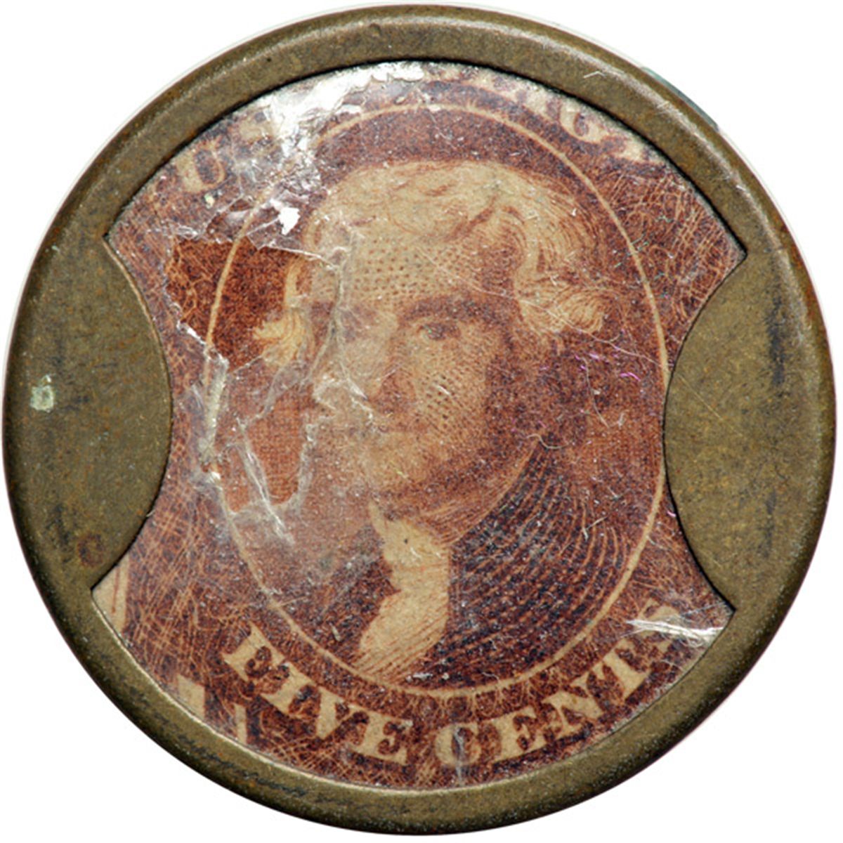 "J. GAULT" EP-78, HB-131, S-96, 5¢ Plain frame. . Fr-EP-78. The case of this Gault piece is very attractive and problem-free and displays very little signs of wear. The mica is chipped near the left tab, and displays moderate crazing elsewhere. The stamp retains nearly full color and appears to be undamaged. Extremely Fine.