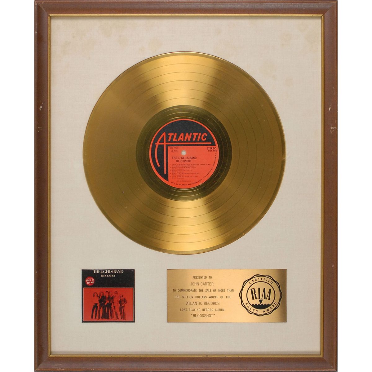 White matte RIAA gold record sales award presented to John Carter “to commemorate the sale of more than one million dollars worth of the…long-playing record album ‘Bloodshot.’” Matted and framed with the plaque and a small reproduction of the album’s cover to an overall size of 17.5 x 21.5. The award retains its original backing and New York Frame & Picture Co. label. Also affixed to the reverse is a short note in an unknown hand, on Dee Anthony Organization stationery, which reads, “John—With many thanks. The J. Geils Band.” In fine condition, with a few tears to backing and a couple of dings to frame.