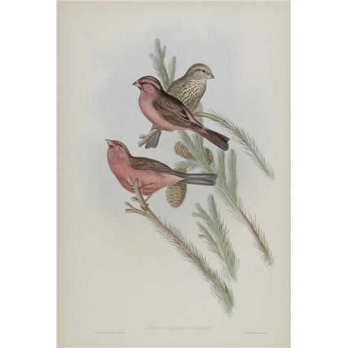 <B>J. Gould Elephant Folio Print: <I>Carpodactus Rhodochlamys.</B></I></B></I> This print depicts the Red Mantled Grosbeak, native to the regions of Upper India, the Himalayas, and Tibet. The plate here shows two males and one female in all of their natural size, and in the wild. Accompanying this print is a page of text which gives Gould's facts and observations about the bird.