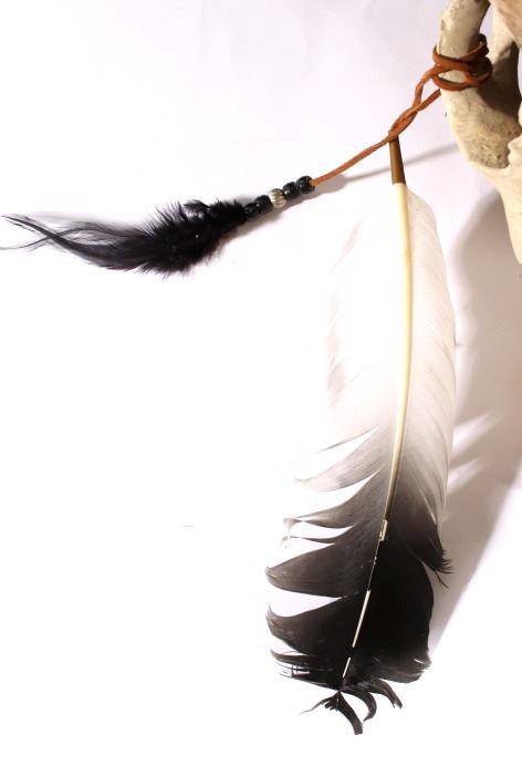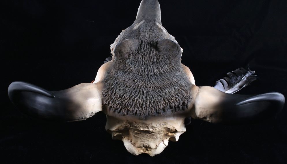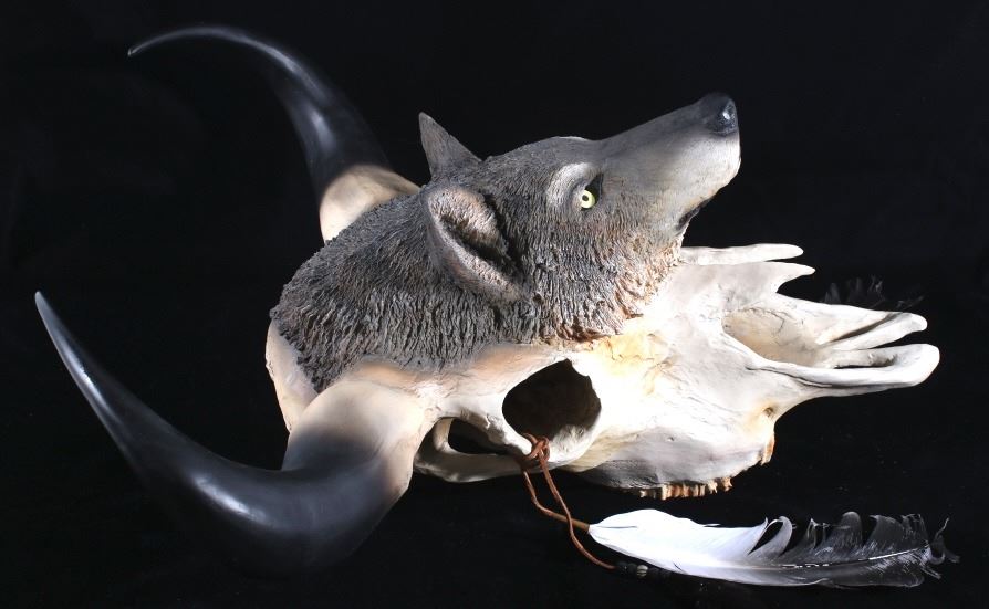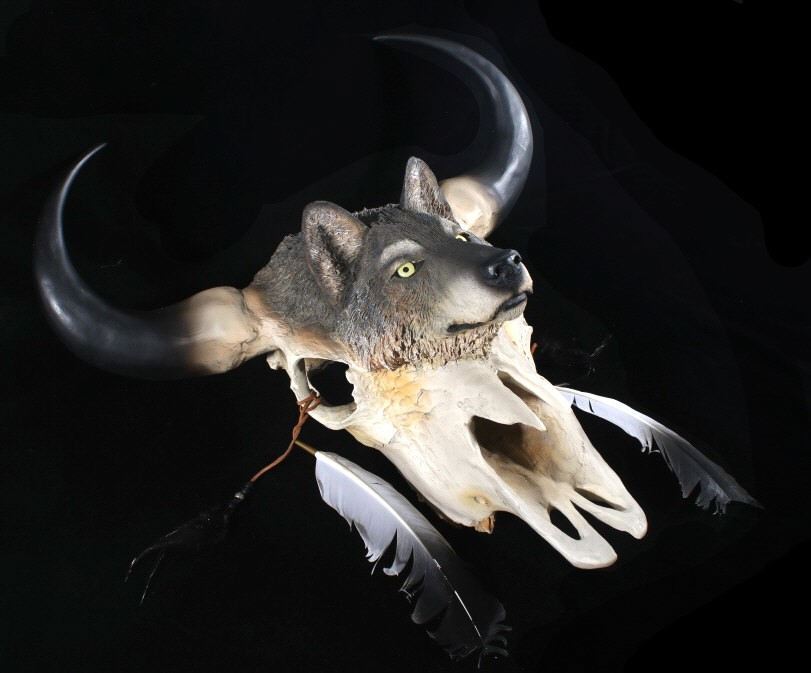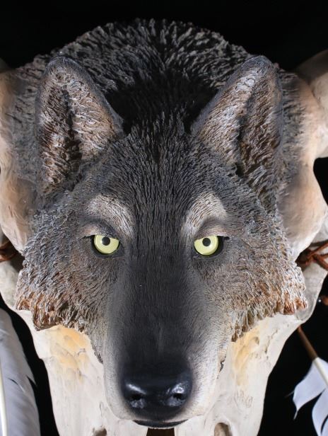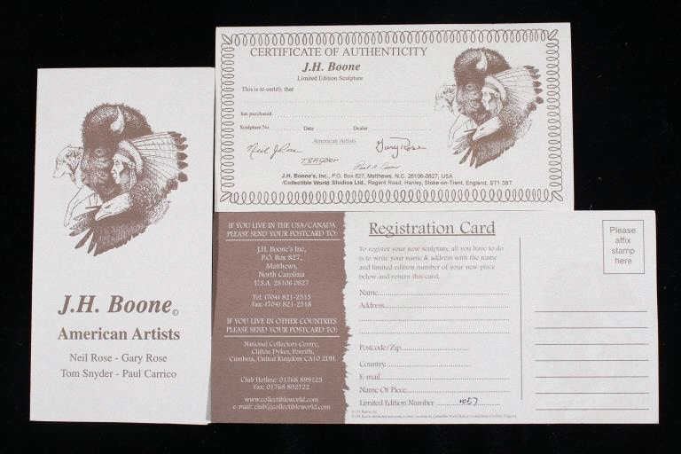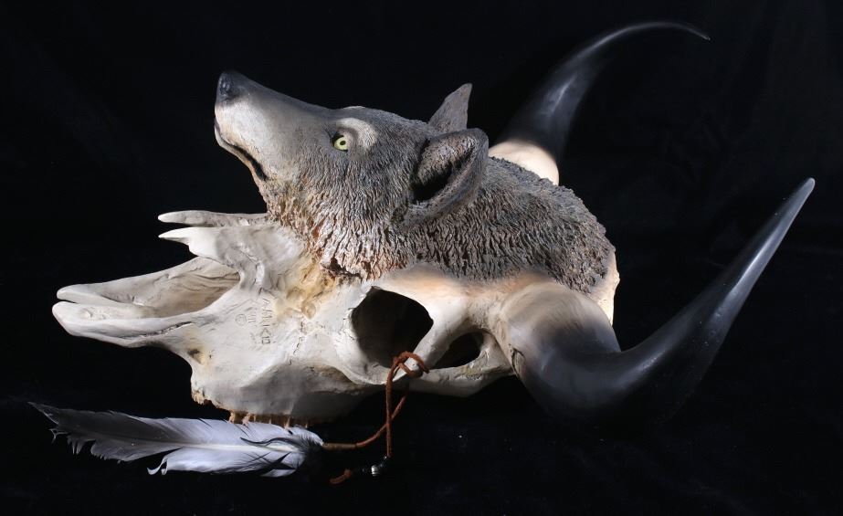 Featured in this lot we have a a limited edition J.H. Boone wall art titled "Earthsong". J.H. Boone is a company known for their American wildlife and Native American art. The company consists of four artists, Neil Rose, Gary Rose, Tom Snyder, and Paul Carrico. The art piece shows a wolf head protruding from the top of a buffalo skull. The sculpture shows wonderful attention to detail with two feathers hanging from leather cords around the buffalo's eyes. The piece comes with its original box as well as the certificate of authenticity, registration card, and information on the artists. The statue is signed "Carrico 98" across left cheek of the skull. The wall art shows very good, new condition. The piece measures 21" wide by 22 1/2" tall.