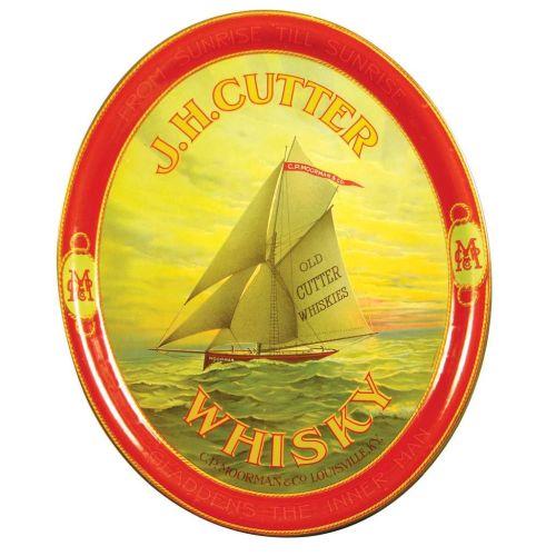 J.H. Cutter Whiskey Tin Serving Tray, The C.P. Moorman and Co. Louisville KY. Depicting tall ship. Great color and graphics. Near mint condition. 13 1/2 X 16 1/2 inches.
