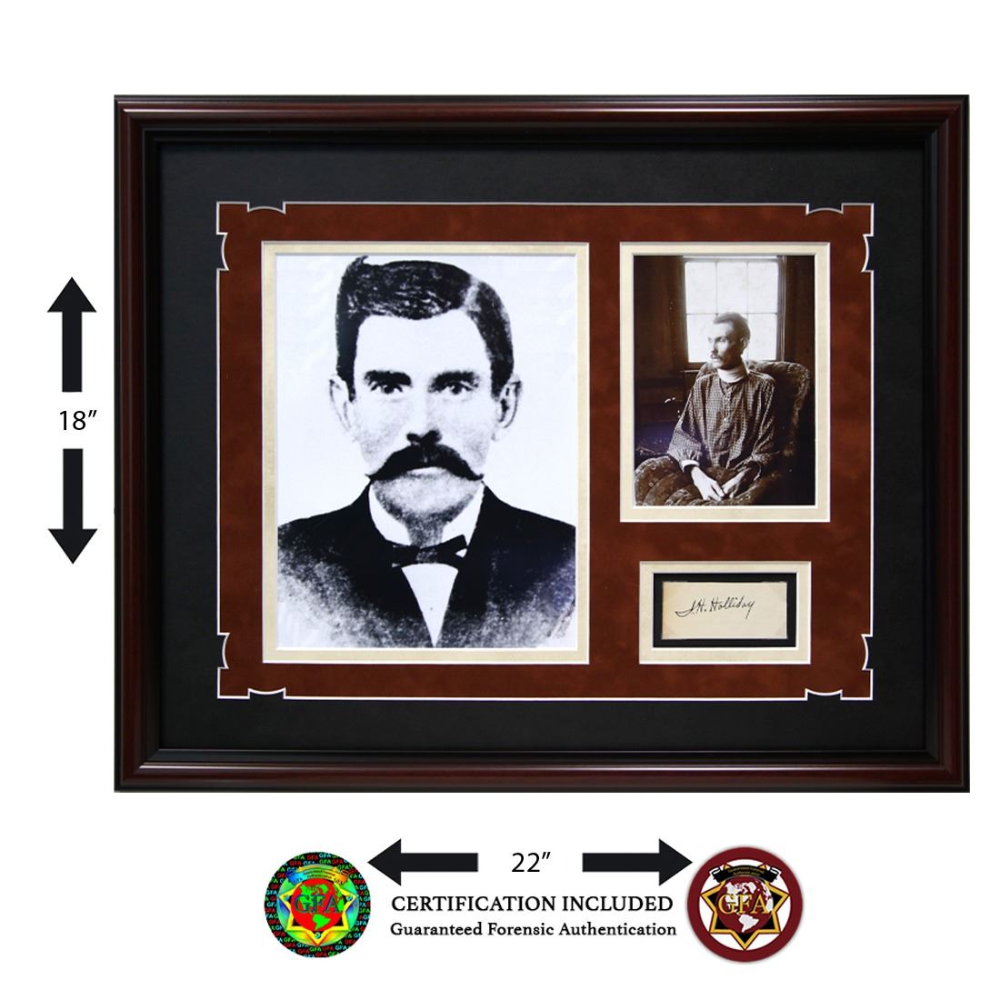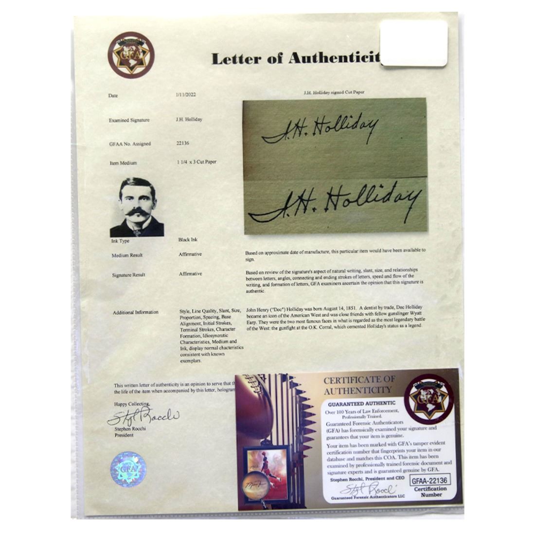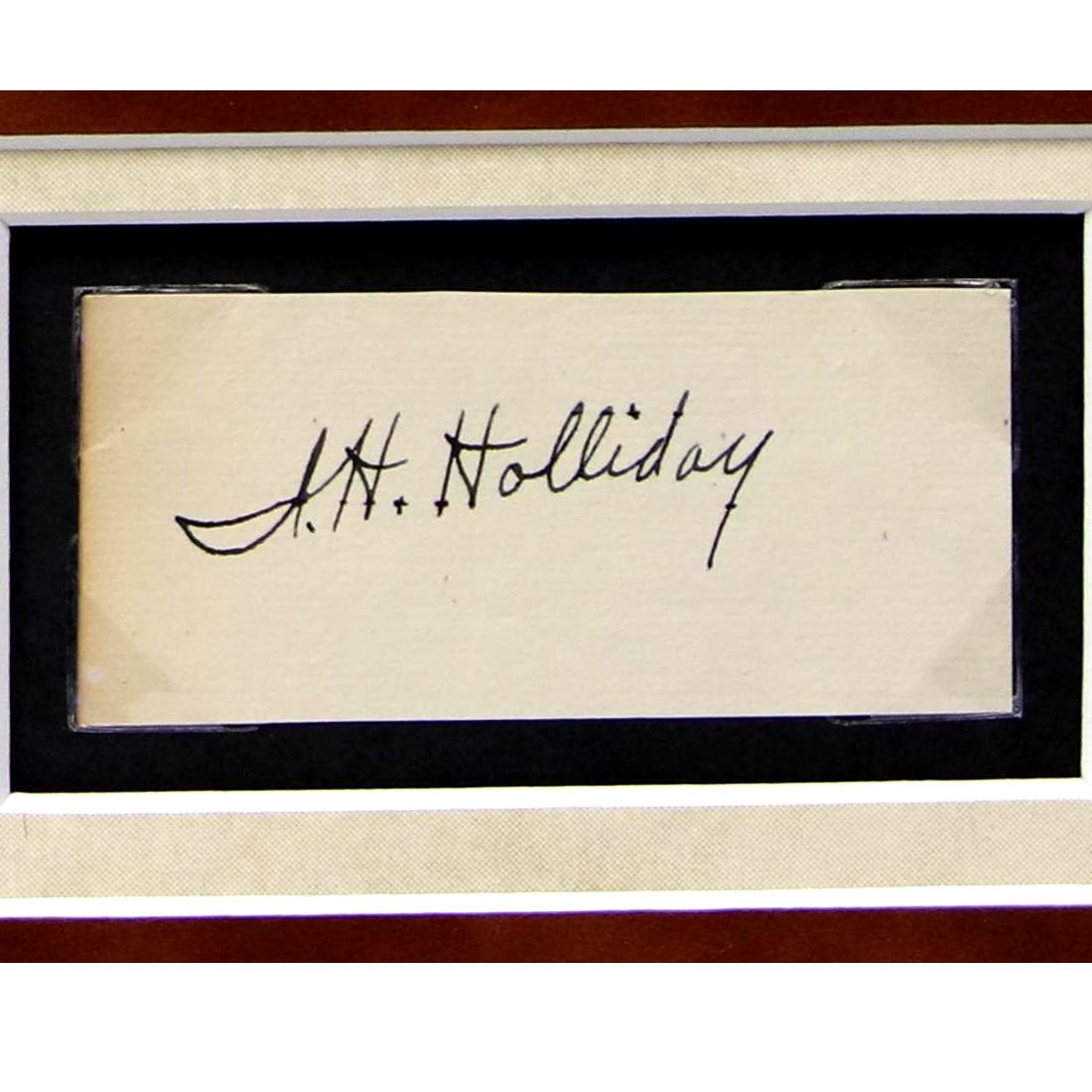 John Henry “Doc” Holliday (1851-1887).1.25x 3” clipped signature. Boldly signed across middle of cut. Character forms can be seen below signature at the bottom of cut. A dentist by trade, Doc Holliday became an icon of the American West and was close friends with fellow gunslinger Wyatt Earp. They were the two most famous faces in what is regarded as the most legendary battle of the West: the gunfight at the O.K. Corral, which cemented Holliday's status as a legend. Professionally custom Matted and Framed. Comes with a Letter of Authentication from Guaranteed Forensic Authenticators (GFA), along with the GFA guarantee of authenticity.