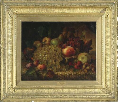 J. H. ROBINSON (19th Century) STILL LIFE OF FRUIT. Oil on canvas still life scene shows a large group of fruit on a thatched mat and in an open basket. The fruit include green and red grapes, pear, apples, plums, peach, raspberries and strawberries. Signed lower right and dated "1874". Housed in what appears to be its original wide, deep gesso decorated gilt frame. The frame has an inner gold liner, which has identification of artist and title. SIZE: 16" x 20". CONDITION: Craquelure, very good. Possibly some old restoration. 9-26754