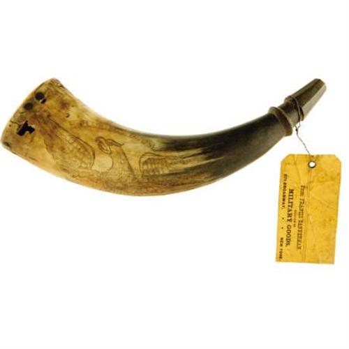 <B>J. H. Waters, 1863 Texas Volunteers Powder Horn.</B></I> Finely etched with an eagle, wings outstretched. The shield on the eagle's breast has a single star. Above the eagle is "E Pluribus Unum", a motto widely used by the Confederates. To each side of the eagle is a cannon and below is a drum. Also below is a riband with "Texas Volunteers 1863". The name, J. H. Waters, is also etched below the eagle.<BR><BR>Wooden cap and copper nails, 11.5" long. At the pouring end, a paper tag is still attached, that reads, "From Francis Bannerman, Dealer in Military Goods, 579 Broadway, New York". <BR><BR>Some insect damage to the horn, else near fine.<BR><BR><b>Shipping:</b> Miscellaneous Collectibles, Smal (<a target="_blank" href="http://www.heritageauctions.com/common/shipping.php">view shipping information</a>)