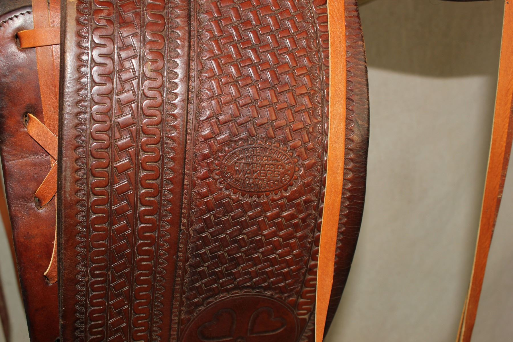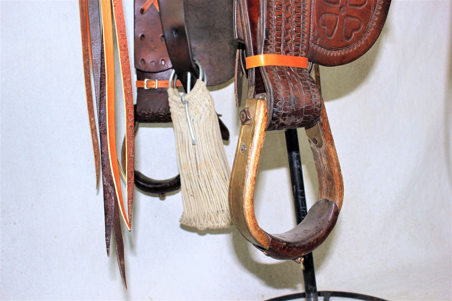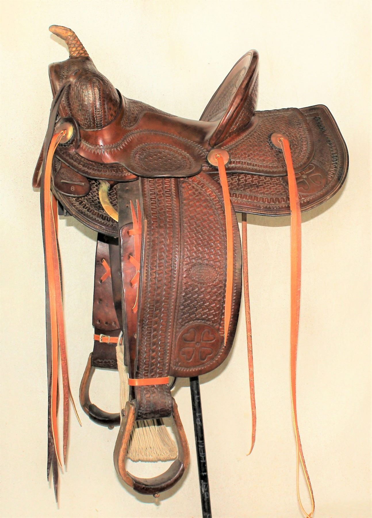 A minty early cowboy saddle with amazing basket stamped design, rawhide braided horn, 5 1/2" high back cantle, 14" seat, and great brass bound ox-bow stirrups.