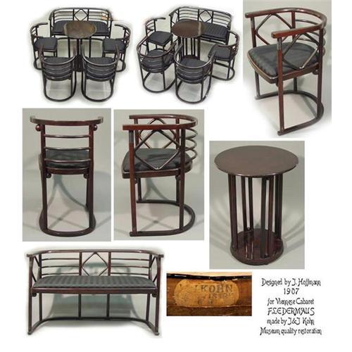 Museum quality 6 pc set designed by Joseph Hoffmann for Viennese Cabaret Fledermaus. Made by J & J KOHN in 1907. Excellent condition after professional restoration, this set consists of love seat, 2 arm chairs, 2 chairs and round table. This set is located in Europe, shipping cost to the US approximately $1900. True INVESTMENT antique....
