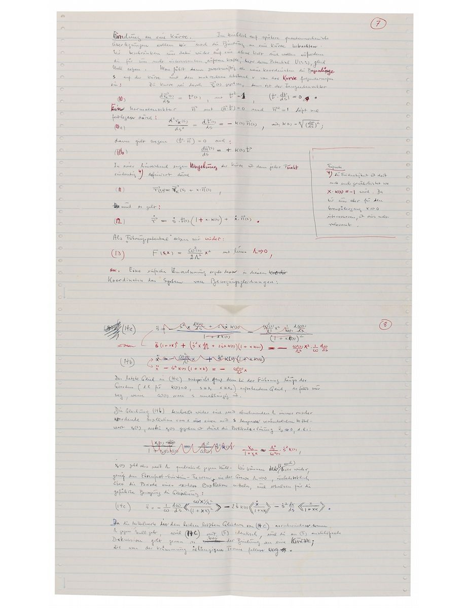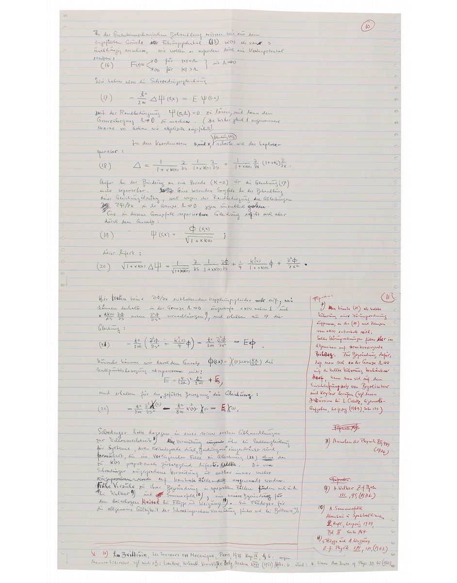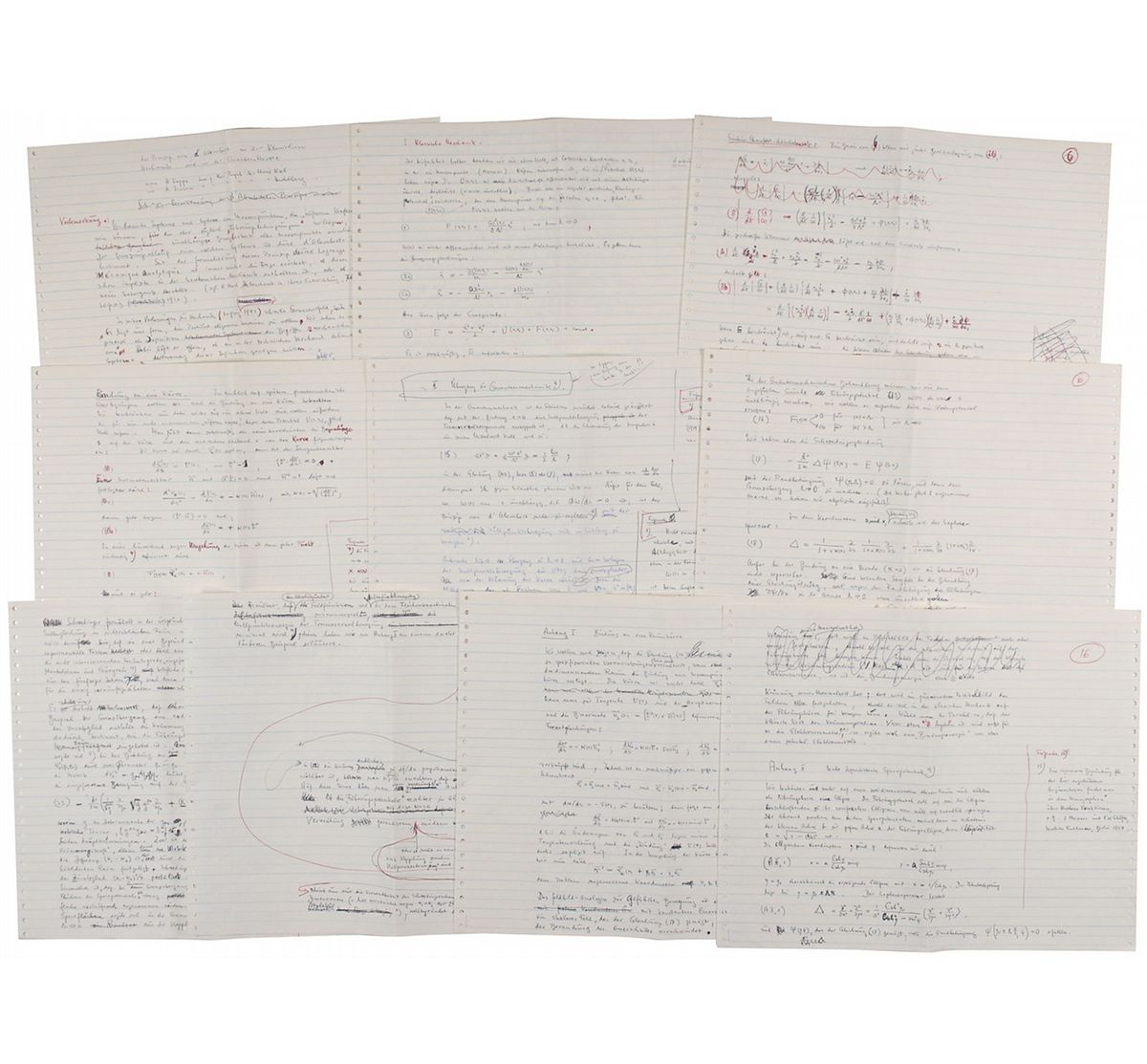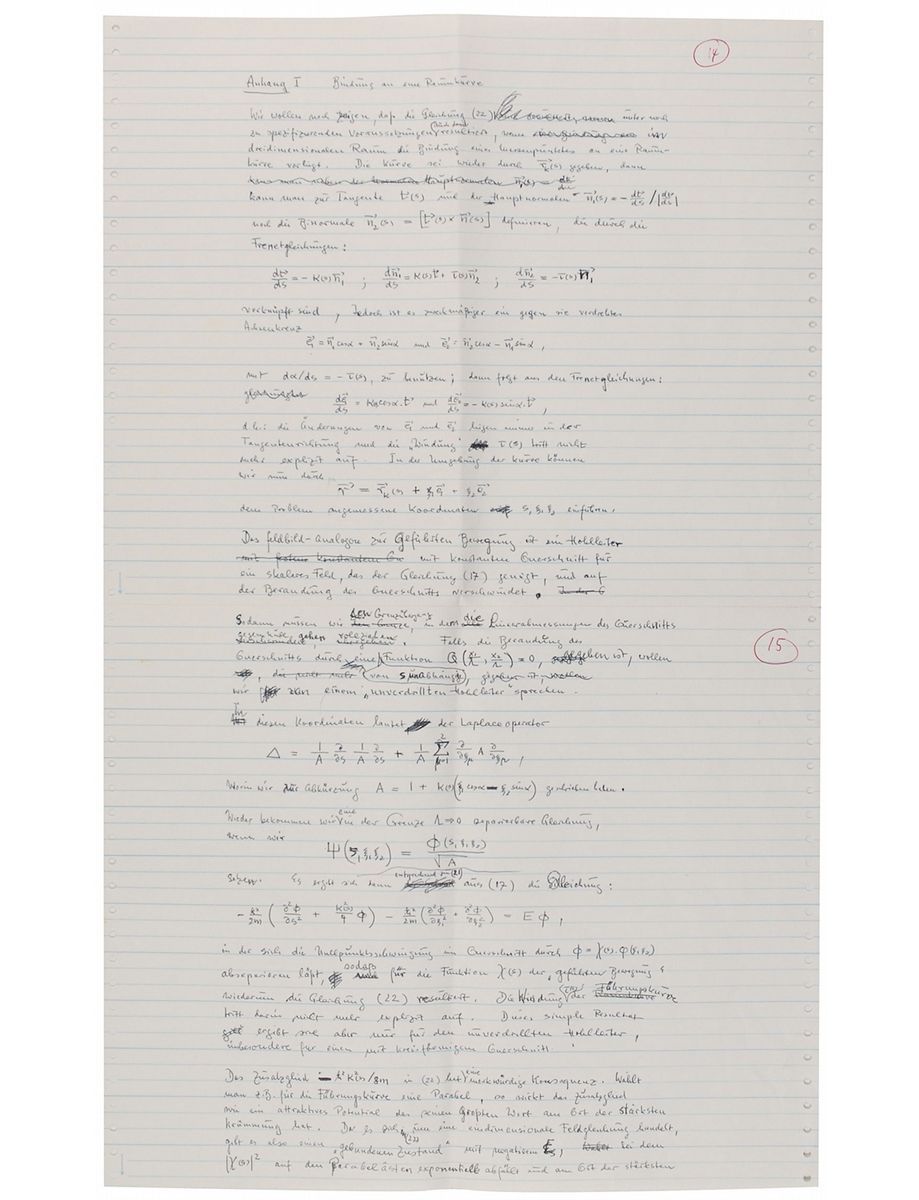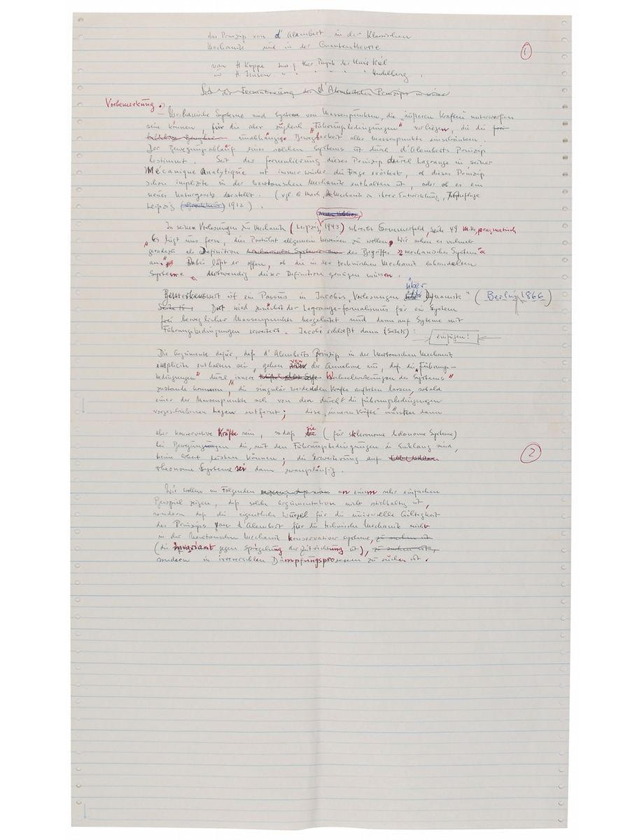 German nuclear physicist (1907–1973) who made contributions to the separation of uranium isotopes and received the 1963 Nobel Prize for Physics with Maria Goeppert-Mayer for their proposal of the nuclear shell model. Autograph manuscript in German, 16 pages on ten separate sheets of lined printer paper, 14.75 x 12, no date but circa 1970. A draft manuscript entitled “The principle of d'Alembert in classical mechanics and in quantum theory,” signed below the title as a contributor, “H. Jensen.” The untranslated manuscript contains several interesting mathematical expressions and is heavily hand-edited and corrected throughout in various inks. In fine condition, with a central vertical fold. Accompanied by the original mailing envelope. Written in collaboration with Heinz Koppe, this paper was presented at the Heidelberg Academy of Sciences in 1971.