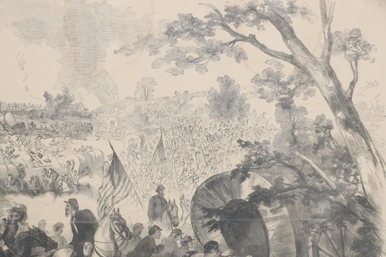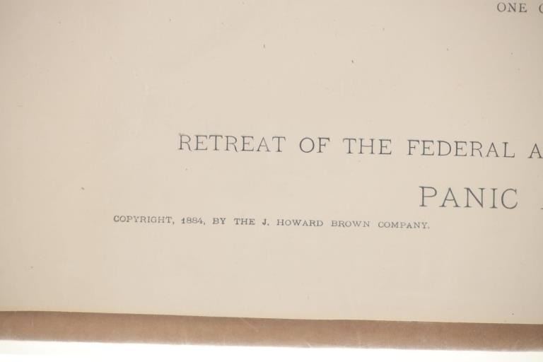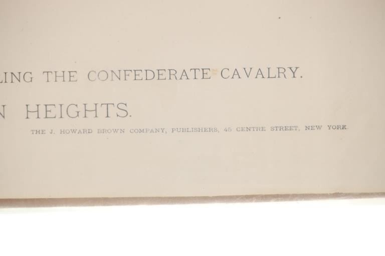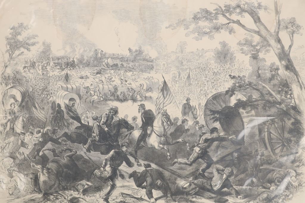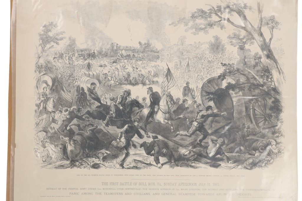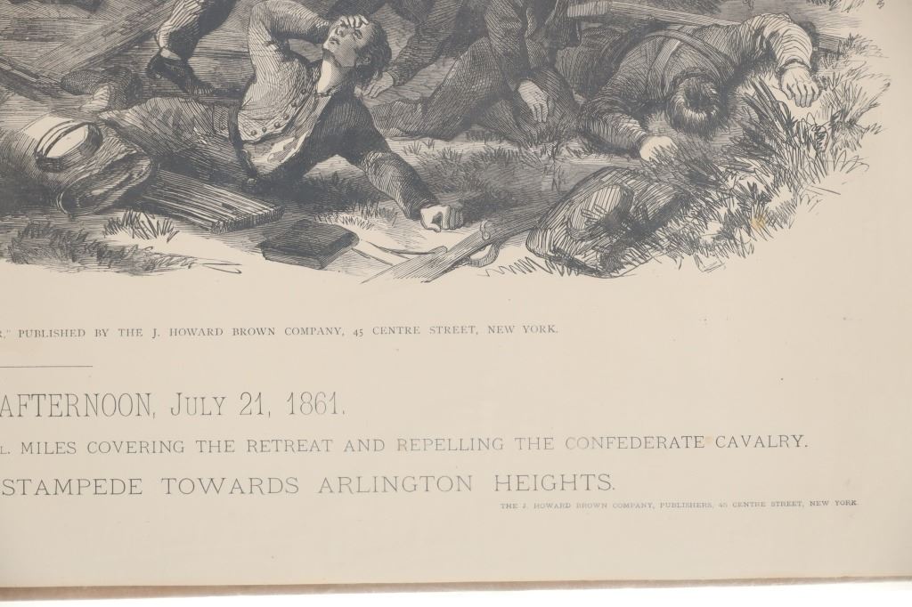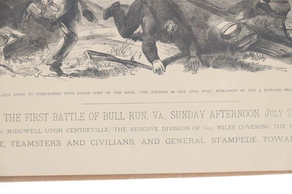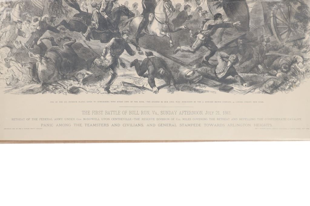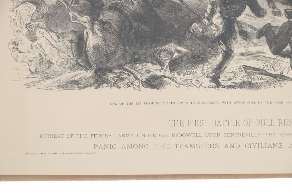Featured in this lot is a J. Howard Brown Co. etching titled "The First Battle of Bull Run". The etching features a battlefield scene with cavalry mobilizing a retreat and the battle raging on in the distance. The etching is marked on the bottom as follows: One of th Six Premium Plates Given to Subscribers with every copy of the book, "The Soldier in our Civil War," Published by the J. Howard Brown Company, 45 Centre Street, New York - The First Battle of Bull Run, VA., Sunday Afternoon, July 21, 1861. - Retreat of the Federal Army Under Gen. McDowell upon Centreville, - The Reserve Division of Col. Miles Covering The Retreat and Repelling The Confederate Cavalry. - Panic Among the Teamsters and Civilians, and General Stampede Towards Arlington Heights. The First Battle of Bull Run, 21 July 1861. Wood engraving, American, 1861". This print takes us back to the heart-wrenching events of the Civil War in America. It depicts the intense and chaotic scene of the First Battle of Bull Run that took place on July 21, 1861. The wood engraving beautifully captures the raw emotions and fierce determination displayed by both Union and Confederate soldiers. The battlefield in Virginia's Manassas region becomes a stage for this historic clash between two opposing forces. As we gaze upon this image, we are transported to a time when our nation was divided and brother fought against brother. In this middle ground between North and South Eastern America, brave men from both sides engaged in warfare with unwavering loyalty to their cause. The Union Army or "Yankees" clashed head-on with the Confederate Army as they fought for control over strategic territories. The significance of this battle cannot be overstated; it marked a turning point in the war as it shattered any illusions about its quick resolution. This wood engraving serves as a poignant reminder of the sacrifices made by countless individuals during one of America's bloodiest conflicts.