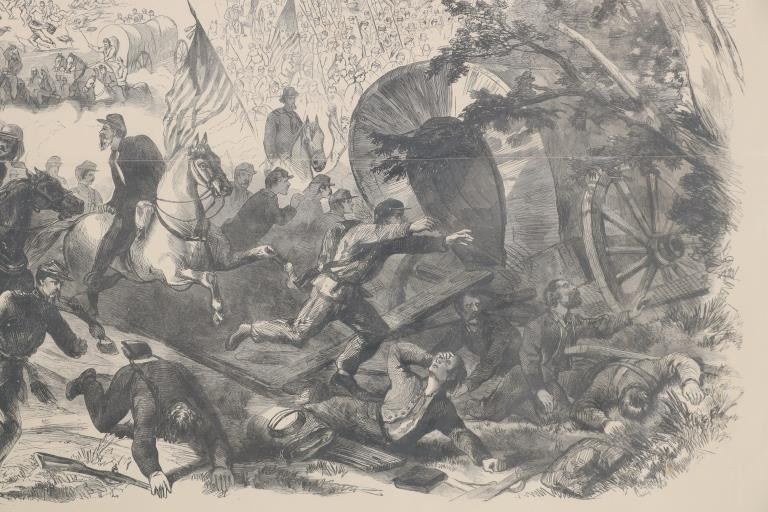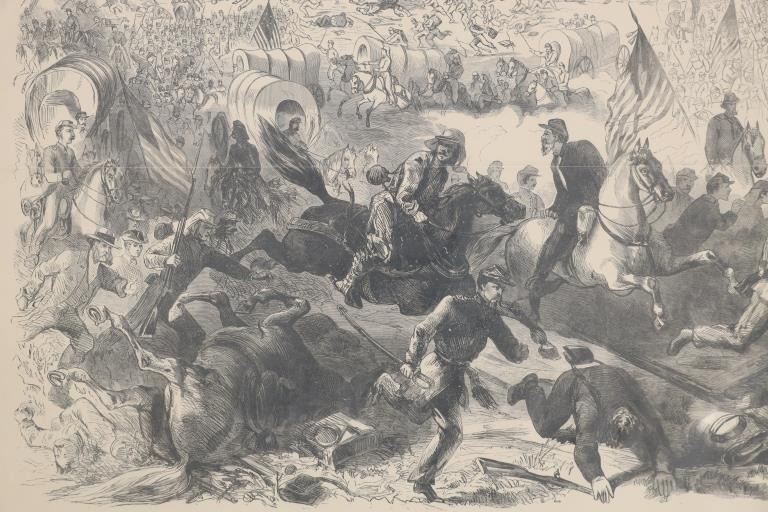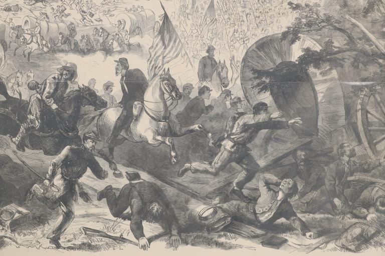 This picture depicts the routing of the Union forces by Rebel cavalry. Many civilians had come from Washington, D.C. to watch the battle, which they thought the Union would win, and were caught up in the panic of retreat.*