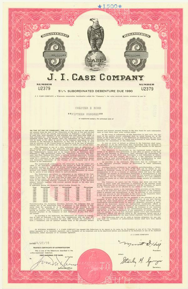 1975. Wisconsin. Bond bearing 5 1/2% interest. Pink/Black. Vignette of eagle standing atop globe at top center. A nice bond from this well-known heavy equipment maker. Punch cancelled and Extremely Fine.