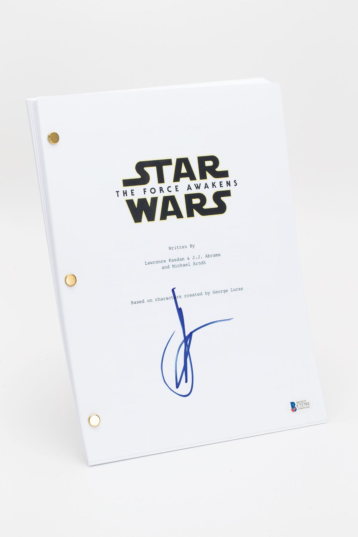 Brad-bound souvenir script for Star Wars: The Force Awakens, 8.5 x 11, signed on the front cover in blue felt tip by writer-director J. J. Abrams. In fine condition, with a Beckett Authentication Services label affixed to the lower right corner. Accompanied by a certificate of authenticity from Beckett Authentication Services.