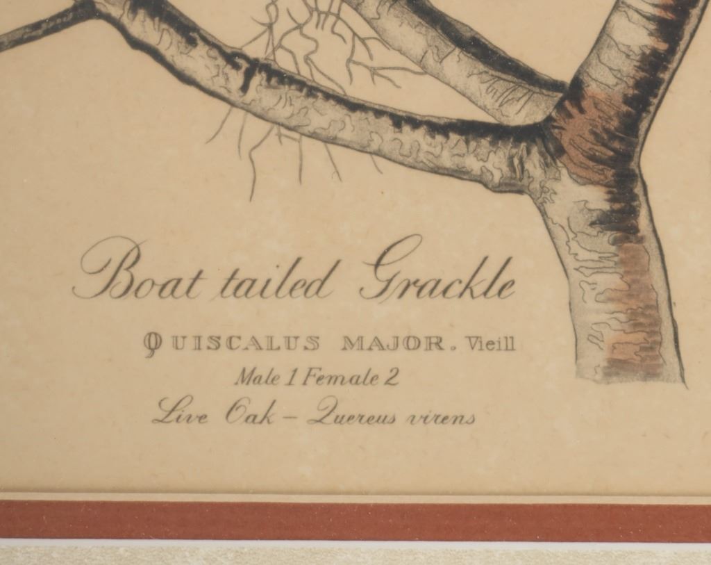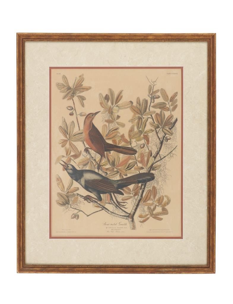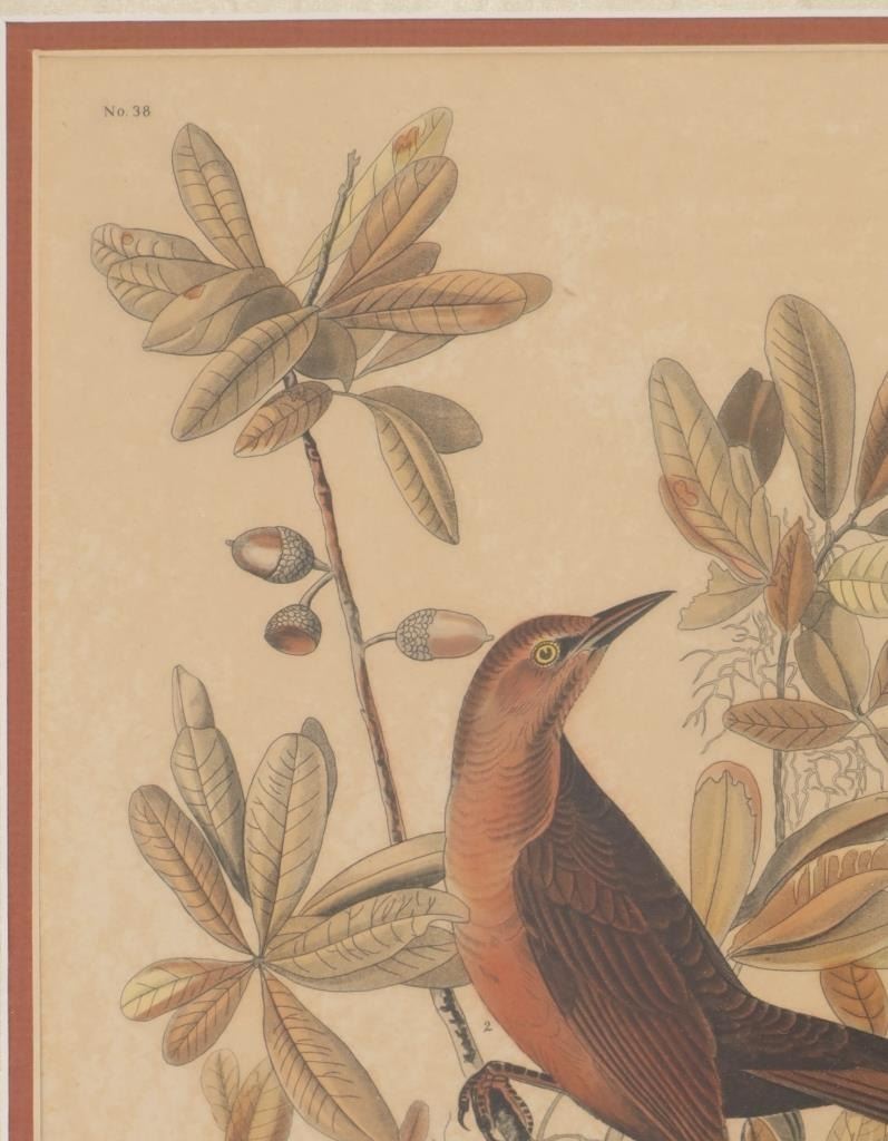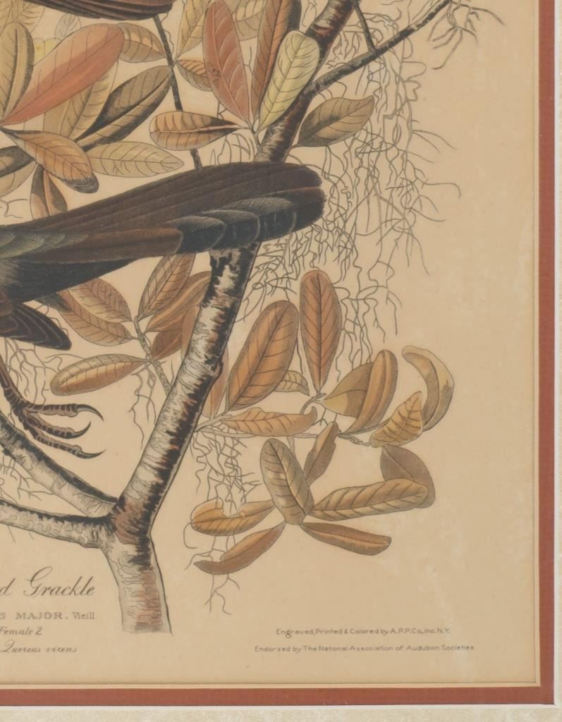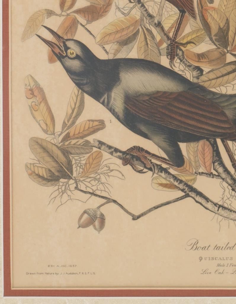 Featured in this lot is this 1940-50s J.J. Audubon(1785—1851) "Boat Tailed Grackle" framed lithograph from his esteemed work, "The Birds of America". Audubon is renowned for his extraordinary undertaking to visually record the birds and mammals of North America. His publications The Birds of America & The Viviparous Quadrupeds of North America are icons of 19th-century art and capture the nascent stages of American natural history. This lithograph is titled, "Boat-tailed Grackle" and shows two sitting in an area of branches and leaves. One looks around its surroundings as the other opens his mouth to make a call. The top of the lithograph reads, "No. 38 / Plate CLXXXVII" while the bottom reads, "© By A. Inc. 1937 Drawn from Nature by J.J. Audubon, F.R.S.F.L.S. / Boat-tailed Grackle Quiscalus Major. Vieill / Male 1 Female 2 / Live Oak - Luereus virens / Engraved, Printed & Colored by A.P.P. Co., Inc NYC / Endorsed by The National Association of Audubon Societies". The lithograph is set in a gold colored frame and is double matted by white marbled paper and red. The piece shows good condition overall with little to no wear present and no signs of obvious damage. The visible art measures 16 3/8" L x 12 5/8" W, while the entire piece measures 23 3/8" L x 19 3/8" W x 3/4" D.