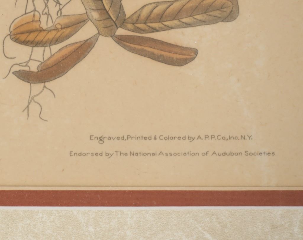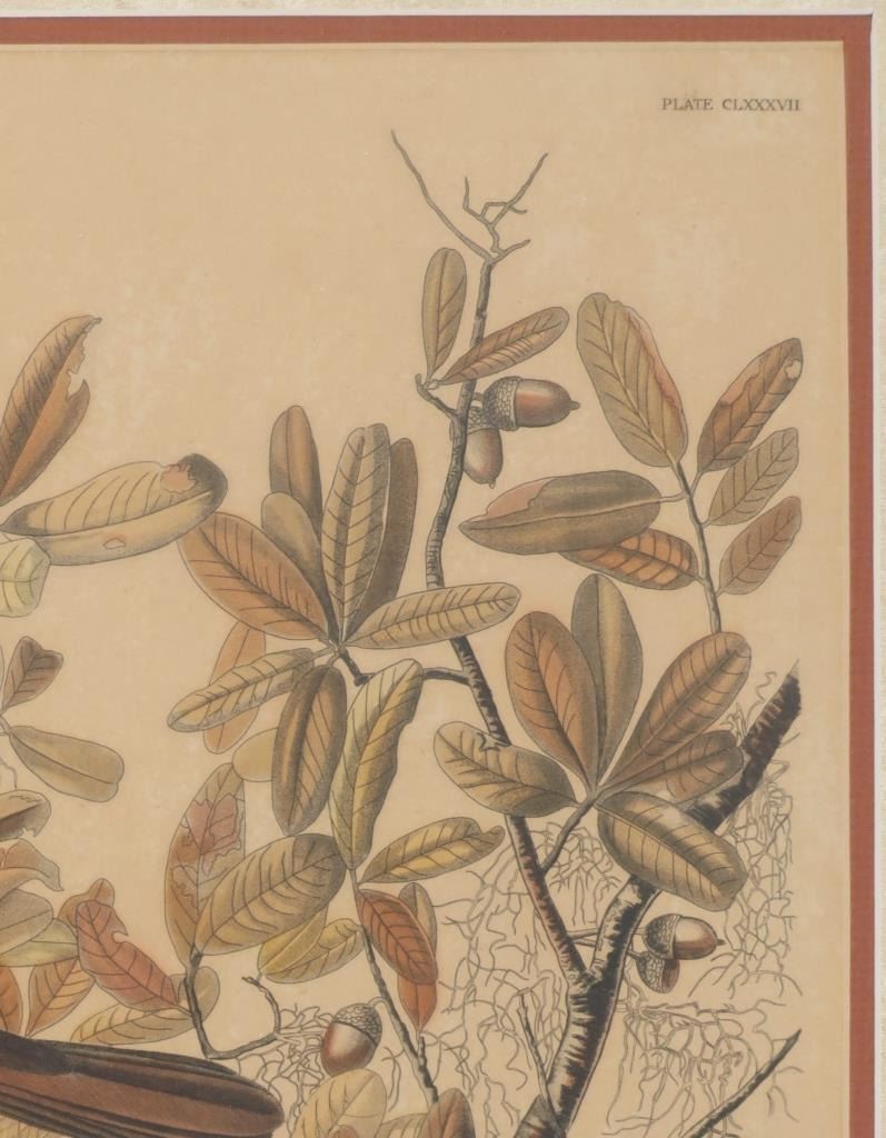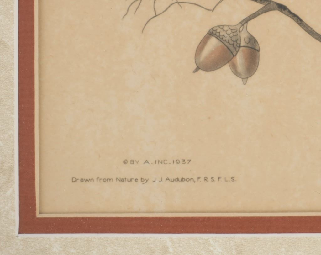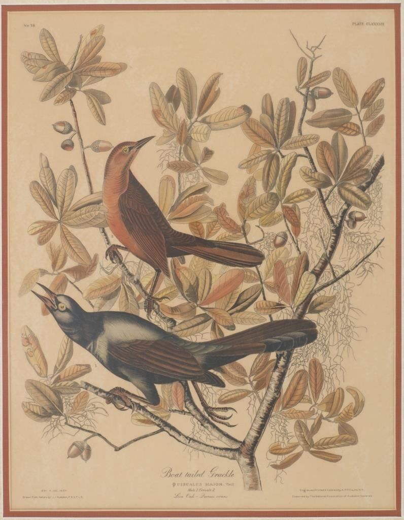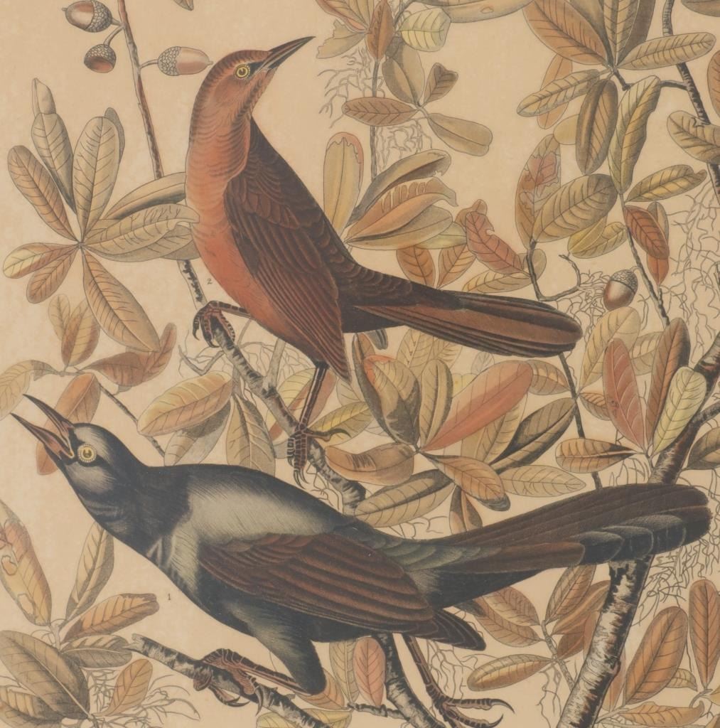 Featured in this lot is this 1940-50s J.J. Audubon(1785—1851) "Boat Tailed Grackle" framed lithograph from his esteemed work, "The Birds of America". Audubon is renowned for his extraordinary undertaking to visually record the birds and mammals of North America. His publications The Birds of America & The Viviparous Quadrupeds of North America are icons of 19th-century art and capture the nascent stages of American natural history. This lithograph is titled, "Boat-tailed Grackle" and shows two sitting in an area of branches and leaves. One looks around its surroundings as the other opens his mouth to make a call. The top of the lithograph reads, "No. 38 / Plate CLXXXVII" while the bottom reads, "© By A. Inc. 1937 Drawn from Nature by J.J. Audubon, F.R.S.F.L.S. / Boat-tailed Grackle Quiscalus Major. Vieill / Male 1 Female 2 / Live Oak - Luereus virens / Engraved, Printed & Colored by A.P.P. Co., Inc NYC / Endorsed by The National Association of Audubon Societies". The lithograph is set in a gold colored frame and is double matted by white marbled paper and red. The piece shows good condition overall with little to no wear present and no signs of obvious damage. The visible art measures 16 3/8" L x 12 5/8" W, while the entire piece measures 23 3/8" L x 19 3/8" W x 3/4" D.
