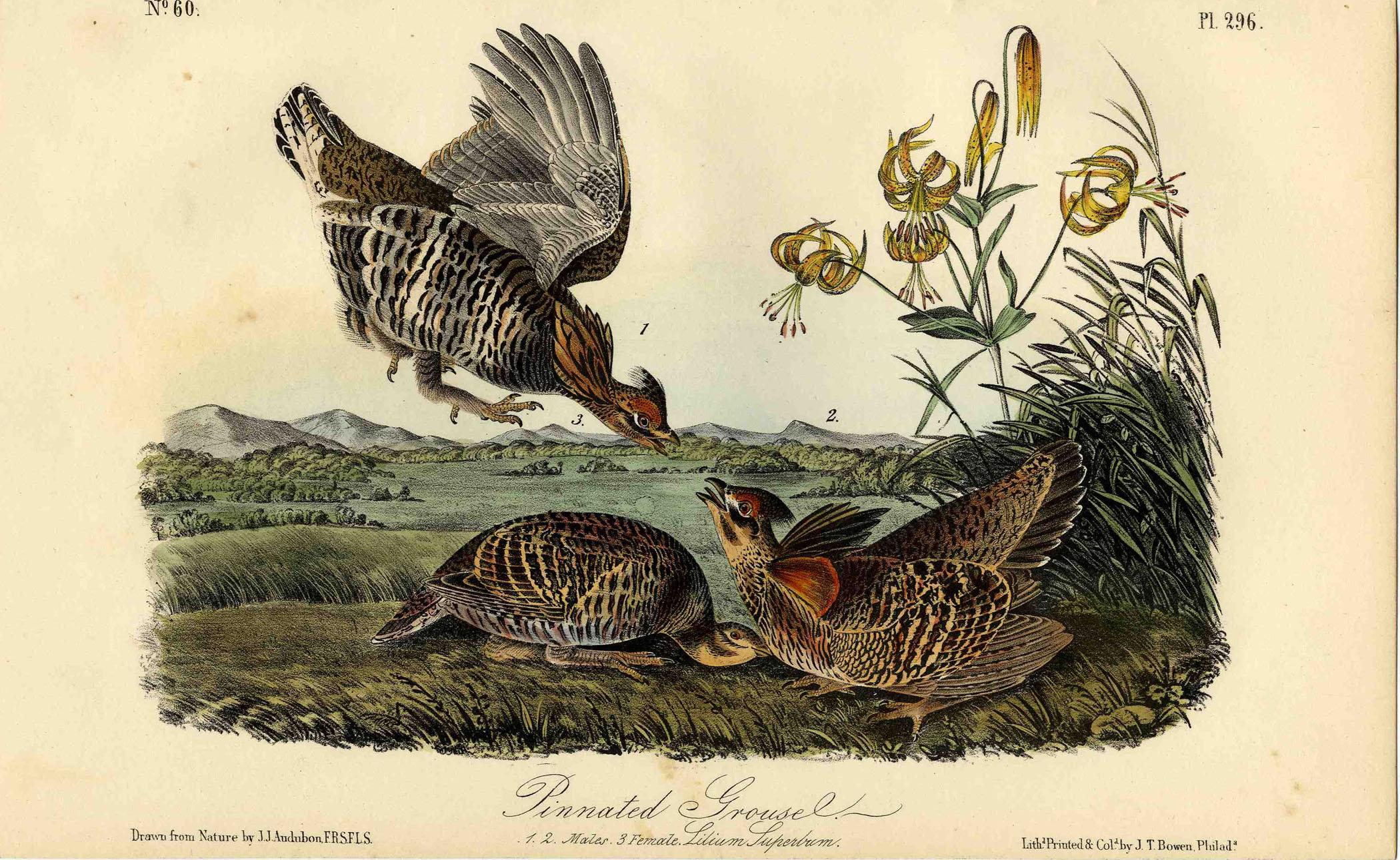1839 original hand-colored lithograph by John James Audubon from his book ''The Birds of America,'' first edition. Printed on thick stock paper, text reads: ''Drawn from Nature by J.J. Audubon…Pinnated Grouse…Lilium Superbum'' and ''Lith Printed & Col by J.T. Bowen Philad.'' Page measures 10'' x 6.5''. Mild toning and scattered foxing. Rough top edge where removed from book, otherwise excellent condition.