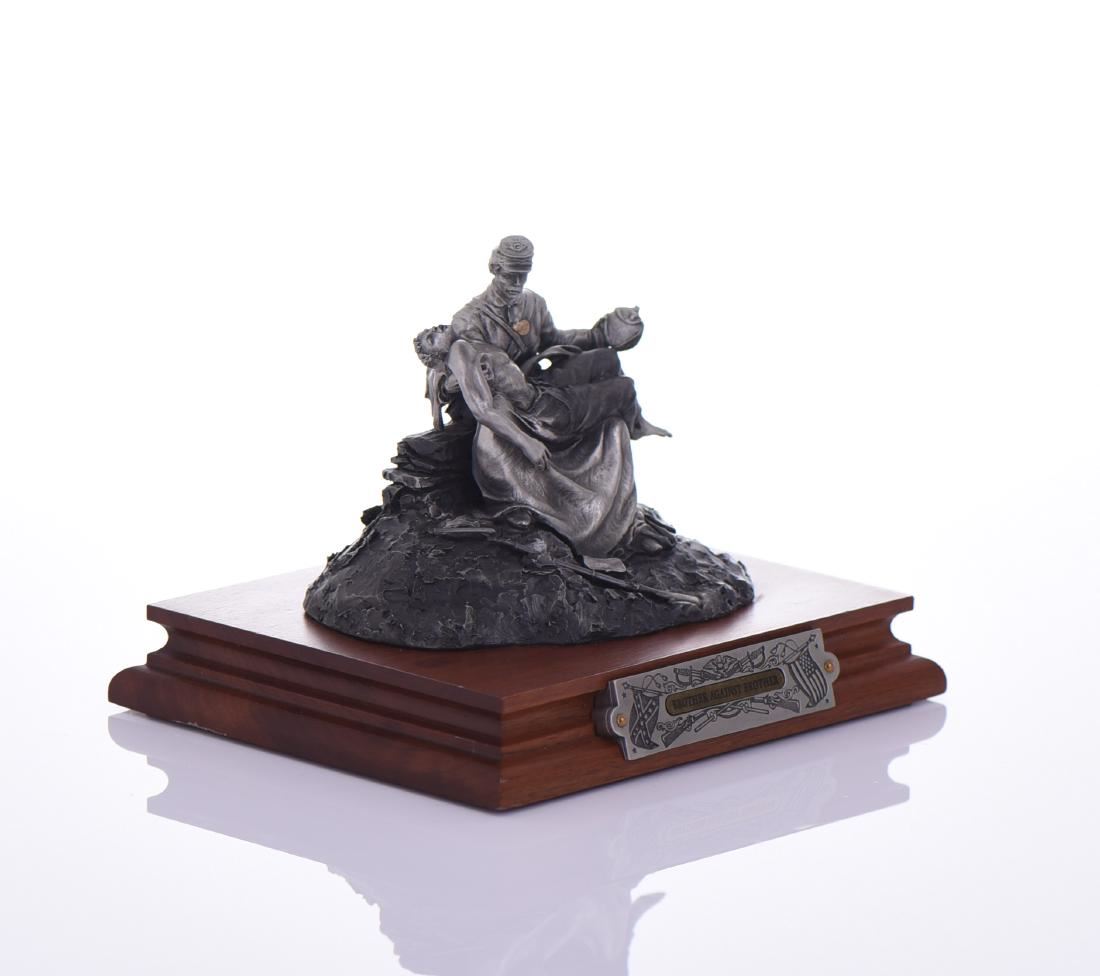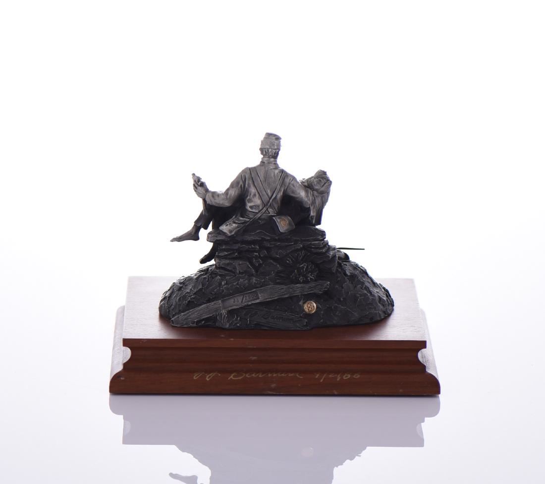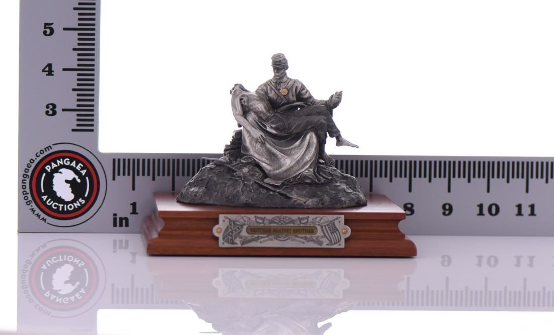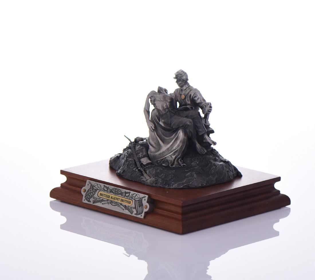 J.J. Barnum, 1988 Signed By Hand In Gold 9/2/88 Titled "Brother Against Brother" 33 of 2500. Chilmark's Fine Pewter On Wood Base Civil War Art Sculpture. Estimated less than 50 yrs old. Pewter is a malleable metal alloy, traditionally 85 to 99 percent tin, with the remainder consisting of copper, antimony, bismuth and sometimes, less commonly today, lead. Silver is also sometimes used. Copper and antimony act as hardeners while lead is common in the lower grades of pewter, which have a bluish tint. It has a low melting point, around 338 to 446 deg F, depending on the exact mixture of metals. (Wikepedia) Size and/or Weight: See Measurement Photo. (Photos Represent The Lot Condition.)
