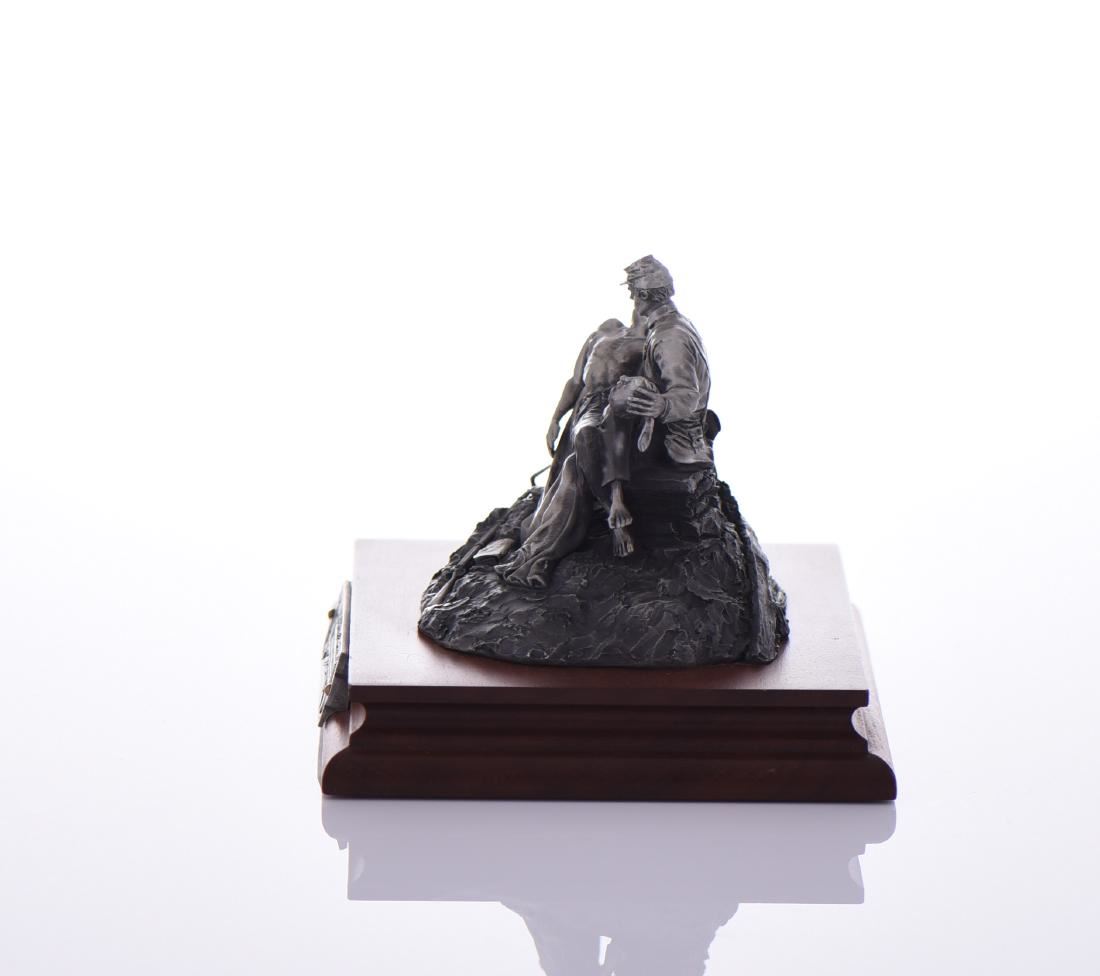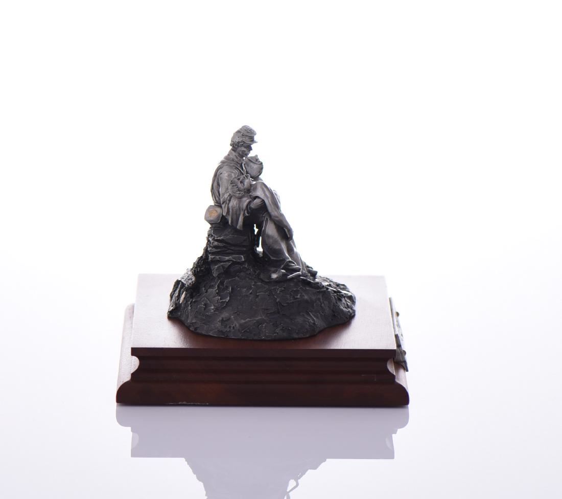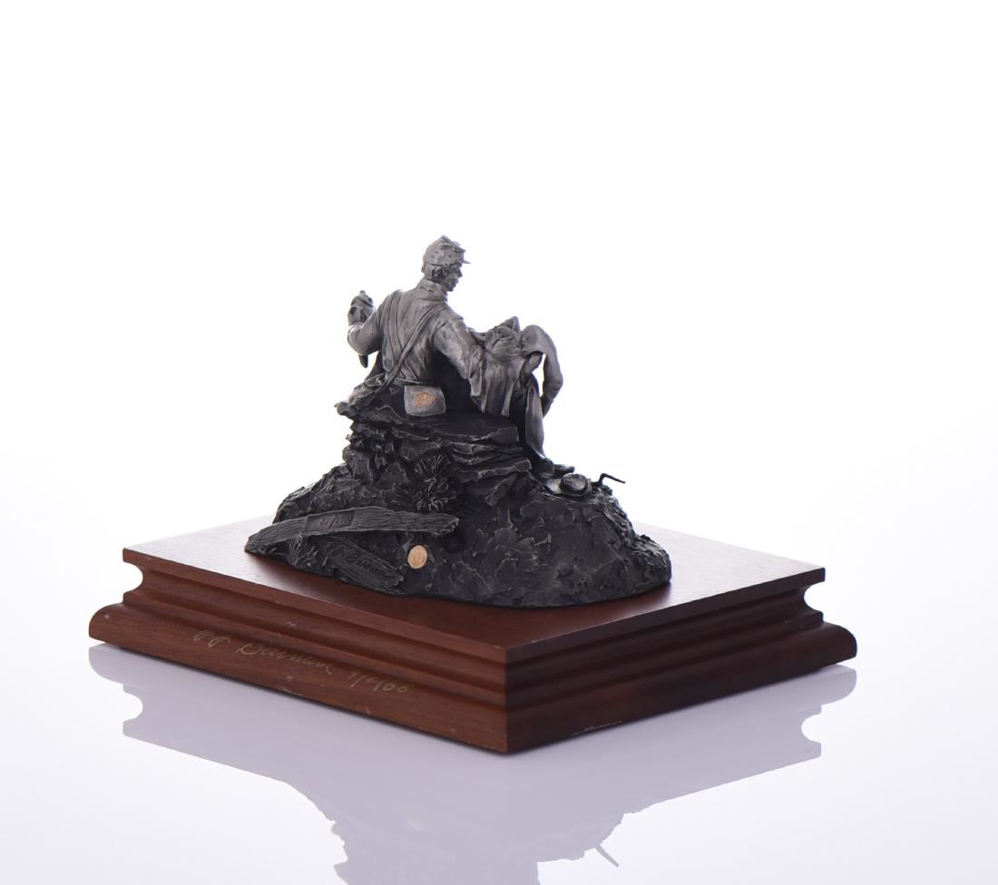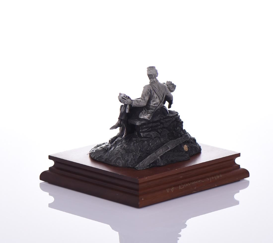 J.J. Barnum, 1988 Signed By Hand In Gold 9/2/88 Titled "Brother Against Brother" 33 of 2500. Chilmark's Fine Pewter On Wood Base Civil War Art Sculpture. Estimated less than 50 yrs old. Pewter is a malleable metal alloy, traditionally 85 to 99 percent tin, with the remainder consisting of copper, antimony, bismuth and sometimes, less commonly today, lead. Silver is also sometimes used. Copper and antimony act as hardeners while lead is common in the lower grades of pewter, which have a bluish tint. It has a low melting point, around 338 to 446 deg F, depending on the exact mixture of metals. (Wikepedia) Size and/or Weight: See Measurement Photo. (Photos Represent The Lot Condition.)
