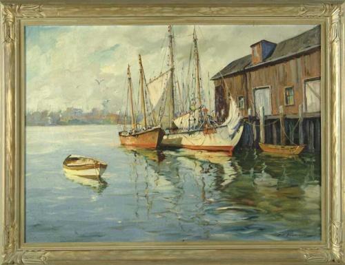 J. J. ENWRIGHT (American, 1905-?) "A CAPE COD HARBOR". Large oil on canvas signed in lower right, depicts two large sail boats at dock with a couple of dories in the foreground. Village in the distance. Framed in original period gold frame; bearing paper label from Loester's Art Galleries. Pencil inscription (very hard to read) indicates date, sales number, order number, etc. Date appears to be 29?? Also signed on stretcher and numbered 4992 "A Cape Cod Harbor", J. J. Enwright; a nice, large, bold and colorful dockside scene for which Enwright is so popular. SIZE: 27-1/2" h x 37-1/2"w. CONDITION: Painting and frame very good. 9-27997