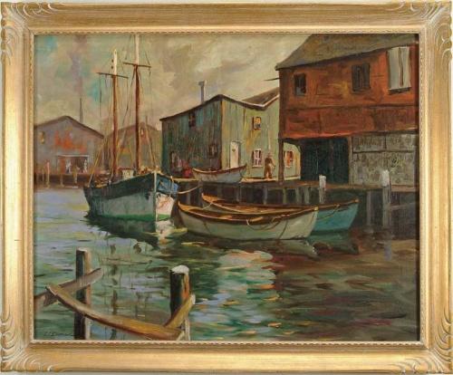J. J. ENWRIGHT (American, 1905-) "FISHING QUARTERS, GLOUCESTER". Oil on canvas scene shows two-mast fishing boat with blue, white and green hull moored alongside buildings. A man walks between buildings and other figures and buildings are seen in back of boat. Other boats are moored along dock. Signed lower left "J. J. Enwright". Housed in its original gilt carved wood frame. Titled and signed on reverse of stretcher. SIZE: 24" x 30". CONDITION: Very good. 9-26438