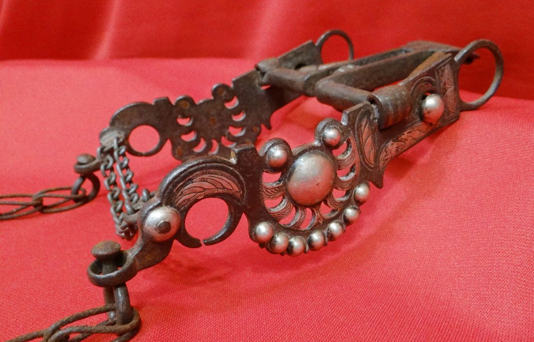 J. J. Estrada pierced cheek bit, engraved & silver inlay w/ rein chains