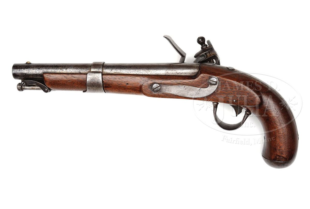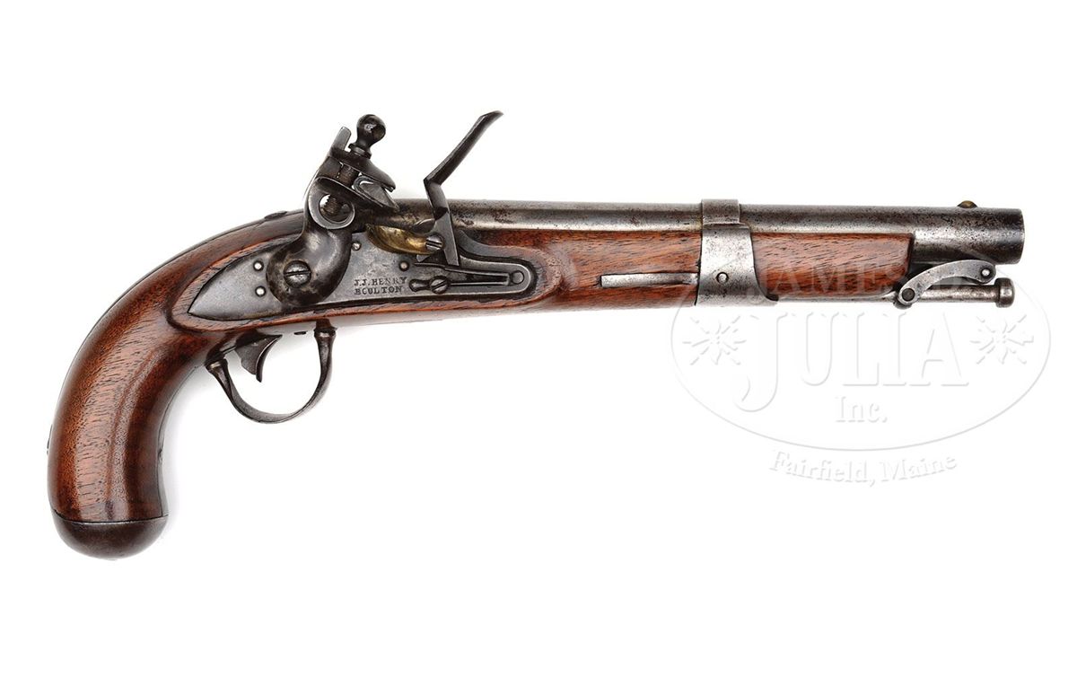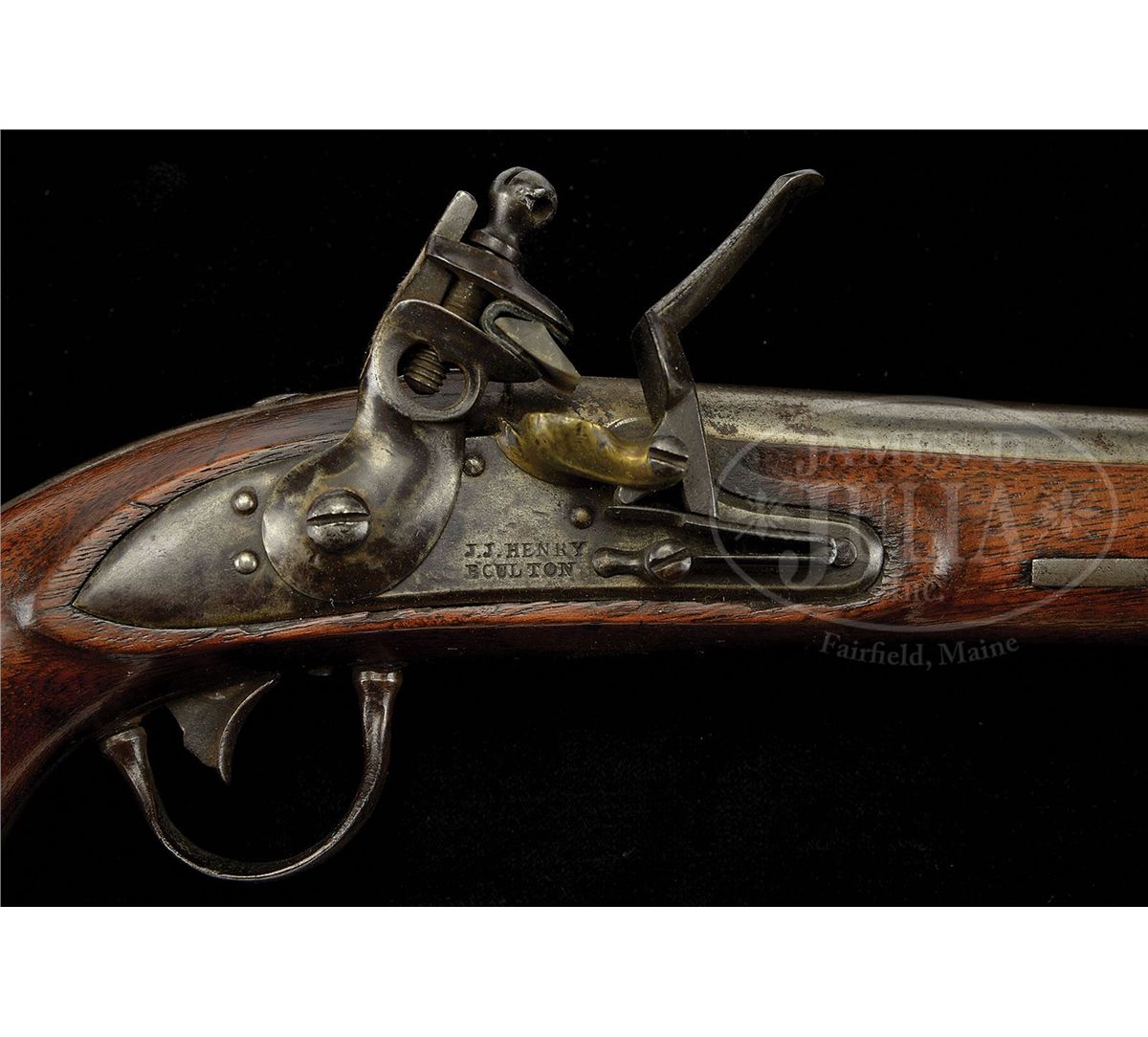 NSN. Cal. .62 smoothbore. This J.J. Henry, Boulton, Pennsylvania, Model 1826 U.S. type flintlock pistol was made circa 1836. Pistol has a swivel ramrod and one barrel band. Lockplate is marked “J.J. Henry/Boulton” ahead of the hammer. This type of pistol is believed to have been made for Militia use. PROVENANCE: Collection of Woody Frey CONDITION: Very good condition throughout. 4-48481 RG30