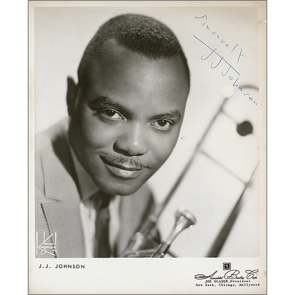 Vintage glossy 8 x 10 publicity photo of Johnson by James J. Kriegsmann of New York, signed in blue ballpoint, "Sincerely, J. J. Johnson." In fine condition, with a speck of emulsion loss to upper right edge.