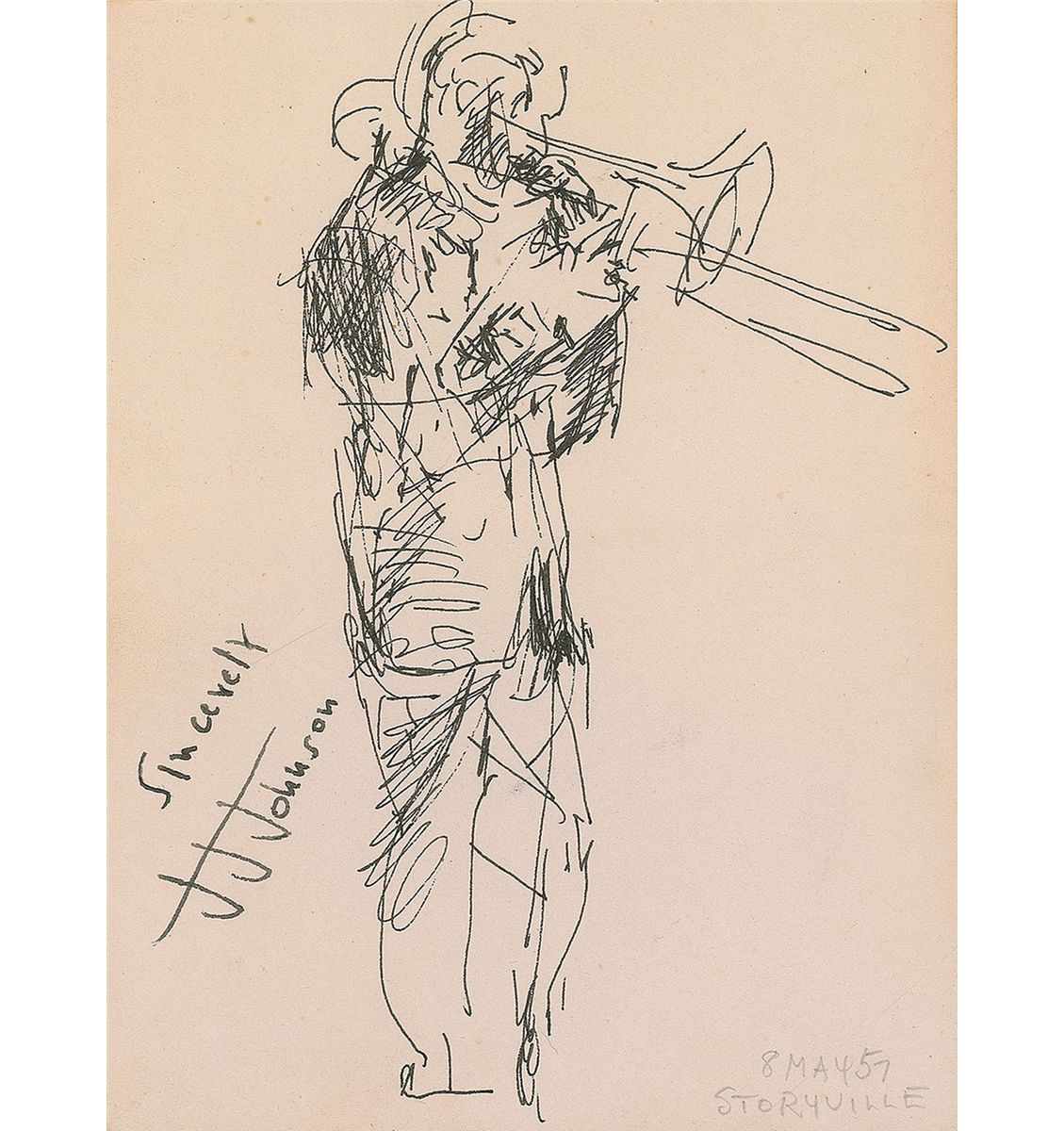 Jazz trombonist, composer and arranger (1924-2001). Original vintage signed ink sketch of Johnson playing the trombone, done by an unknown artist, on an off-white 5 x 6.5 sheet, signed “Sincerely, J J Johnson,” with a collector’s pencil notation to lower right. In fine condition.