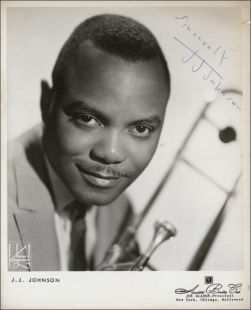 Jazz trombonist, composer and arranger (1924-2001). Vintage glossy 8 x 10 publicity photo, signed in blue ballpoint, “Sincerely, J J Johnson.” In very good condition, with some scattered light surface marks and creases, and mild toning to borders.