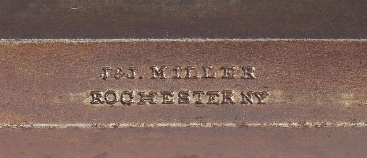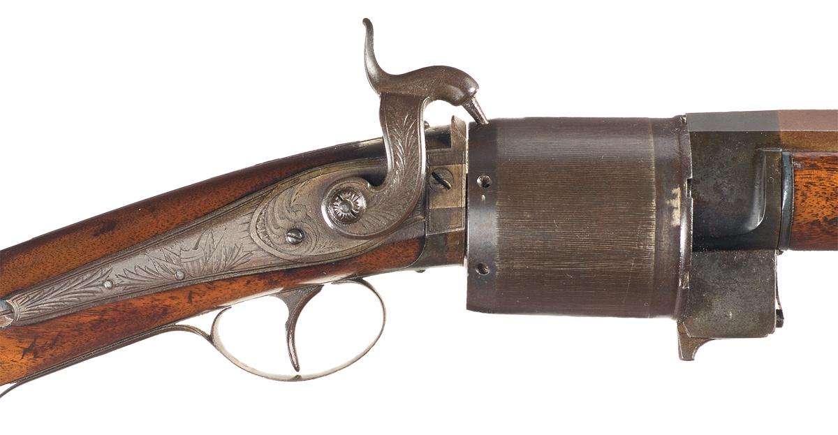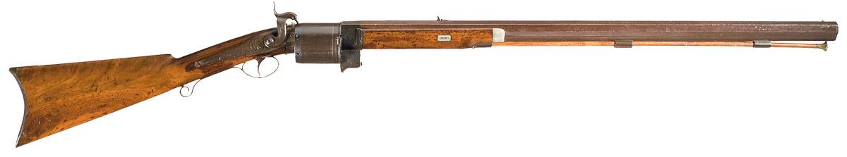 Made circa 1835-1850, at least 15 gunsmiths made the revolving rifle under the Miller patent and it's estimated that only a few hundred were produced. Pinched blade front and notch rear sights, with the two line "J&J MILLER / ROCHESTER NY" address on the upper flat. Lightly serrated cylinder, with scroll engraving on the tang, trigger guard, hammer and lock plate, the latter also showing a federal shield and an array of flags. Straight grip stock, with pewter forearm tip, German silver wedge escutcheons, brass tipped ramrod, and smooth buttplate with engraved heel.