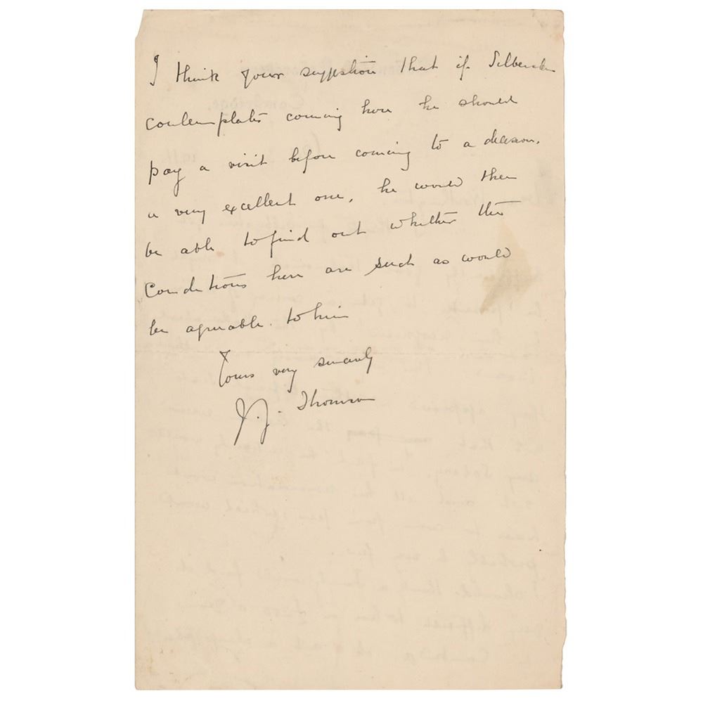 Rare ALS, one page both sides, 4.5 x 7, Cavendish Laboratory, Cambridge letterhead, October 3, 1911. Handwritten letter to "Worthington," in full: "I think if Silberstein got sufficiently good testimonials it might be possible to get a course of lectures by him recognized by the Mathematical Board: this would merely mean that they appeared in the official list, not that the lecturer received any salary. In fact he certainly would not and all his remuneration would have to come from fees, which would probably be very few. I should think a family would find it very difficult to live on £250 a year in Cambridge. It is not a cheap place. I think your suggestion that if Silberstein contemplates coming here he should pay a visit before coming to a decision, a very excellent one. He would then be able to find out whether the conditions here are such as would be agreeable to him." In fine condition.