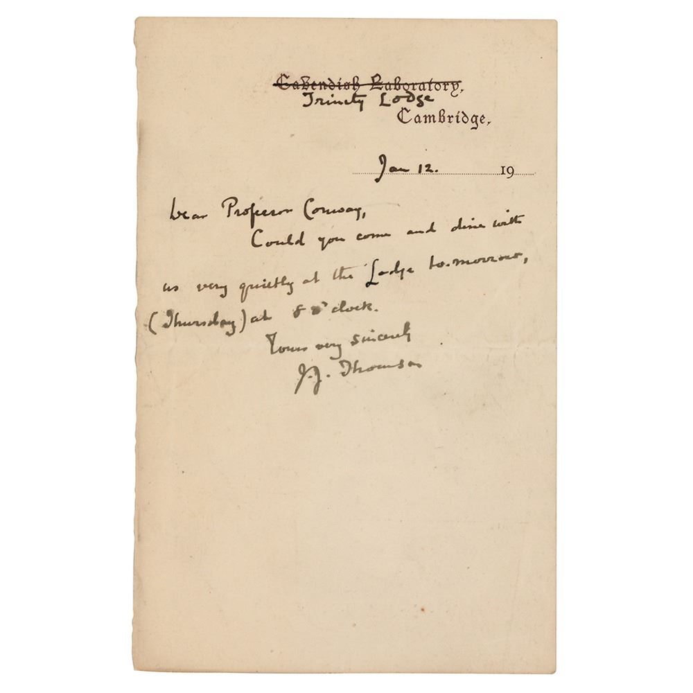 Important English physicist (1856–1940) who received the Nobel Prize for Physics in 1906 for his discovery and identification of the electron. Rare ALS, one page, 4.75 x 7, Cavendish Laboratory, Cambridge letterhead (struck through and altered to "Trinity Lodge"), January 12, no year (circa 1918-1919). Brief handwritten letter to distinguished Irish mathematical physicist Professor Arthur W. Conway, in full: “Could you come and dine with us very quietly at the Lodge to-morrow, (Thursday) at 8 o’clock.” In fine condition, with some light creasing. Thomson's alteration of the letterhead from Cavendish Laboratory to Trinity Lodge places this letter, at the earliest, in 1918, the year he became Master of Trinity College in Cambridge, a position that he held until his death. His predecessor, Henry Montagu Butler, died on January 14, 1918. That Thomson is still using his old Cavendish Laboratory letterhead points to a possibly hasty transition from one institution to the other. Only the third instance in which we have offered Thomson in any format.