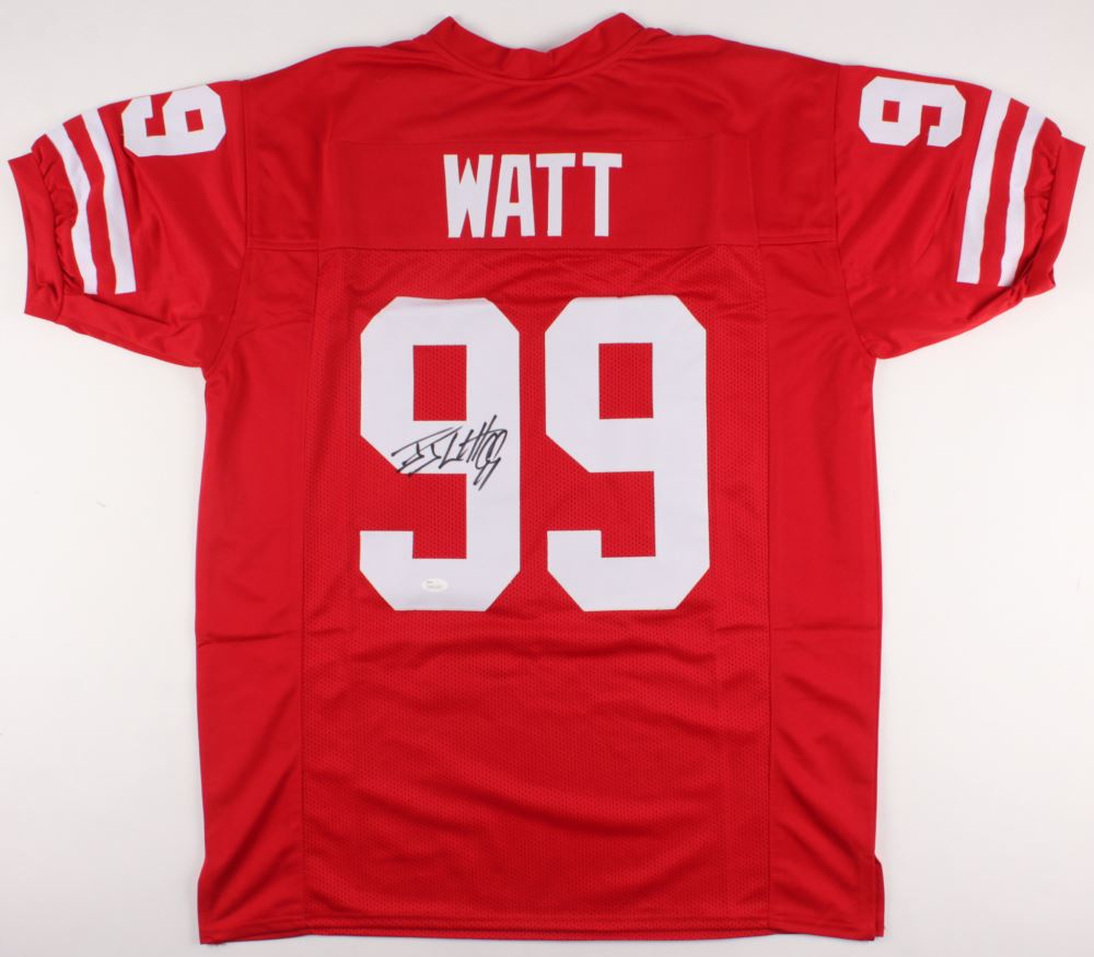 Custom on-field style jersey. Everything is sewn on, size XL. Hand-signed in black felt-tip pen by J. J. Watt.