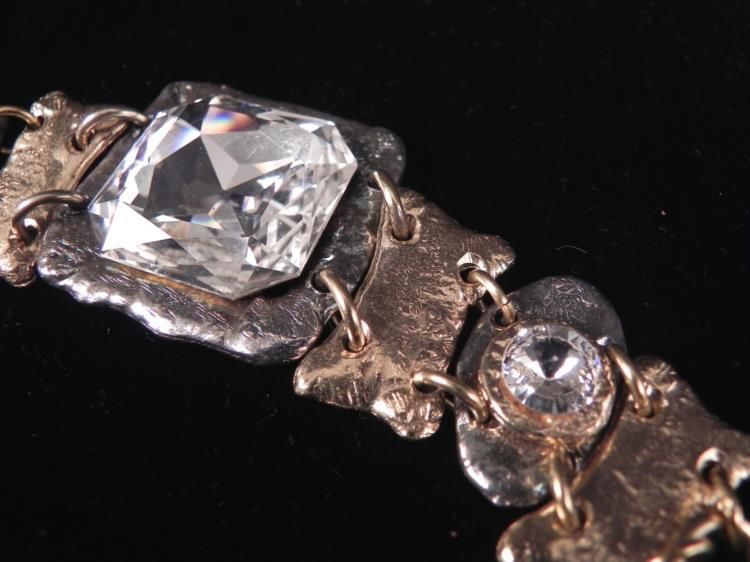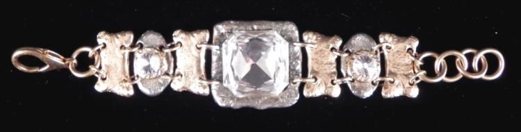 This bracelet is an original J. Jansen Signed creation. It features a large rhinestone at the center, two smaller round rhinestones, all on silver and gold tone metal links, with lobster clasp. The size measures approximately 6". It is in very good condition. * Each J. Jansen piece is unique and hand made by Judy Jansen herself.