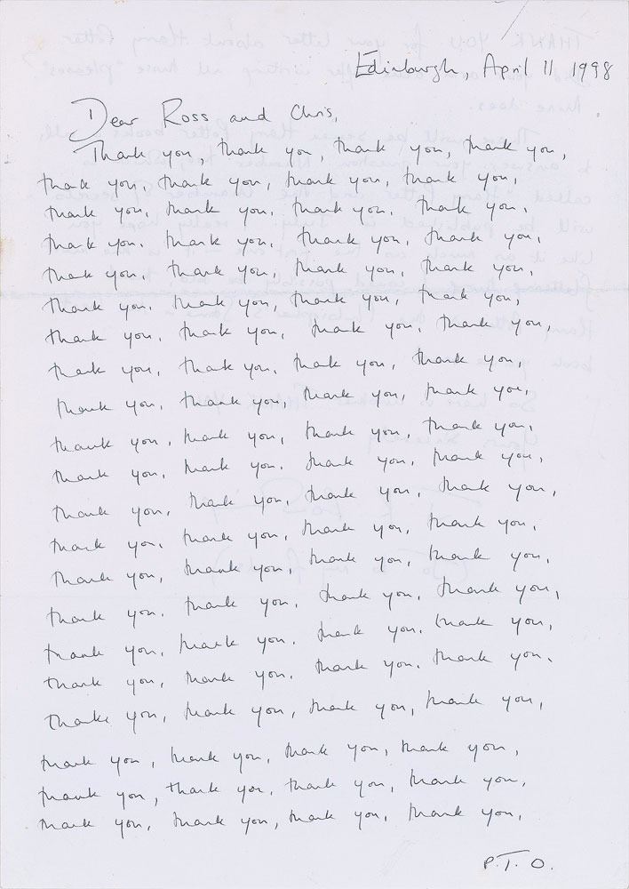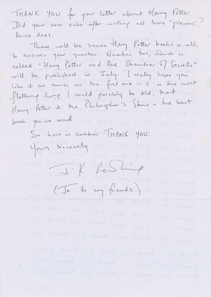 ALS signed “J. K. Rowling, (Jo to my friends),” one page both sides, 8.25 x 11.75, April 11, 1998. Very early letter to "Ross and Chris." After writing "thank you" eighty-four times on the front of the page, Rowling writes, in full: "THANK YOU for your letter about Harry Potter. Did your arm ache after writing all those 'pleases'? Mine does. There will be seven Harry Potter books in all, to answer your question. Number two, which is called 'Harry Potter and the Chamber of Secrets' will be published in July. I really hope you like it as much as the first one—it is the most flattering thing I could possibly be told, that Harry Potter & the Philosopher's Stone is the best book you've read. So here is another THANK YOU." In fine condition.