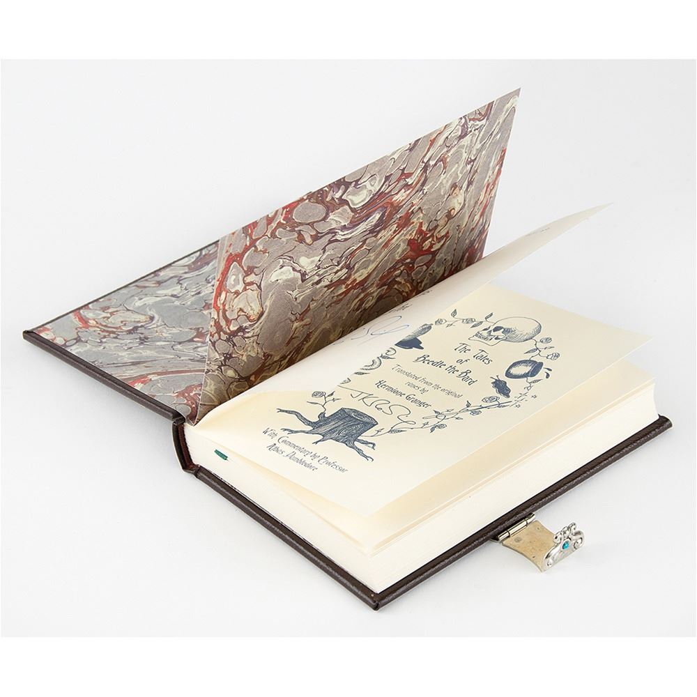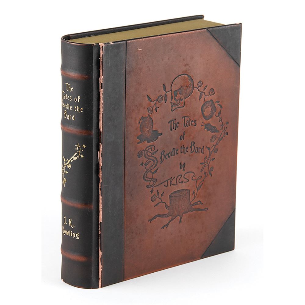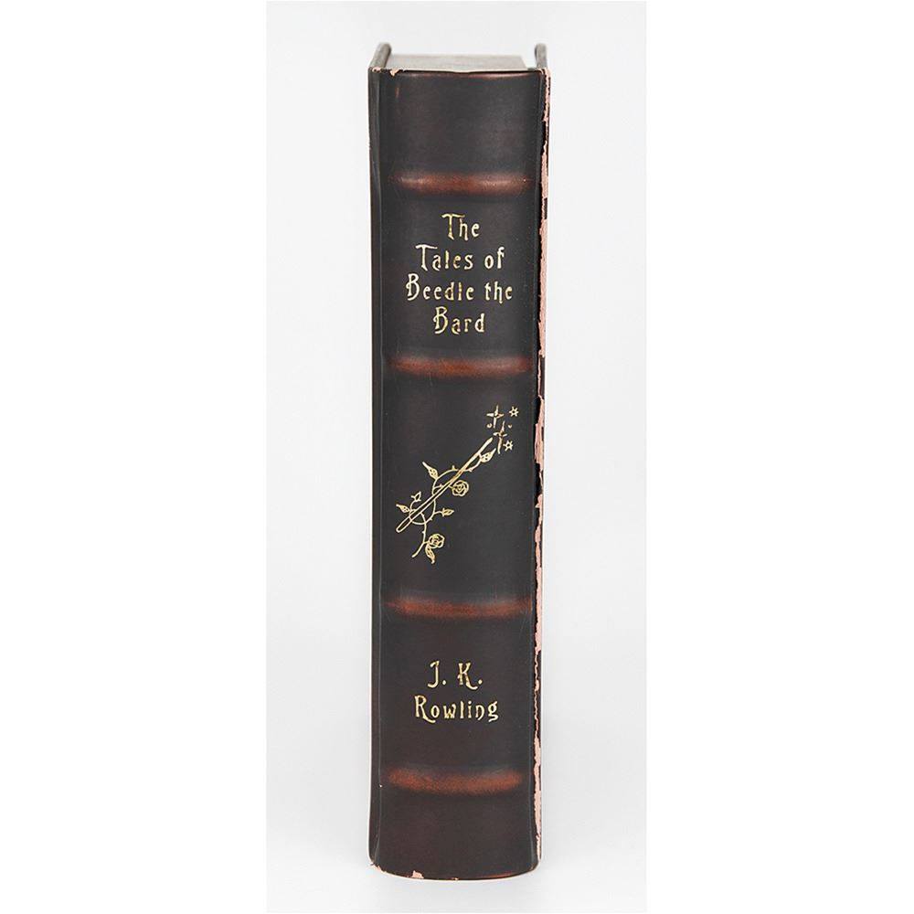 Signed book: The Tales of Beedle the Bard. Deluxe collector's edition, limited issue, numbered 48/100. London: Children's High Level Group, 2008. Ornately embellished hardcover, 4.75 x 6.75, 179 pages. Beautifully signed on the half-title page in blue felt tip, "J. K. Rowling." Complete with its beautiful embroidered velvet bag, illustration prints, and large leatherbound clamshell case with cardstock slipcover. In fine to very fine condition, with some flaking only to the front hinge of the case and a slightly musty odor; the book itself is flawless. Accompanied by the original shipping box. A scarce and luxurious limited edition.