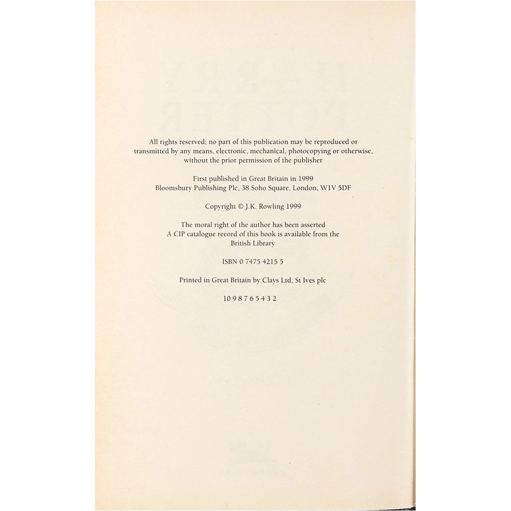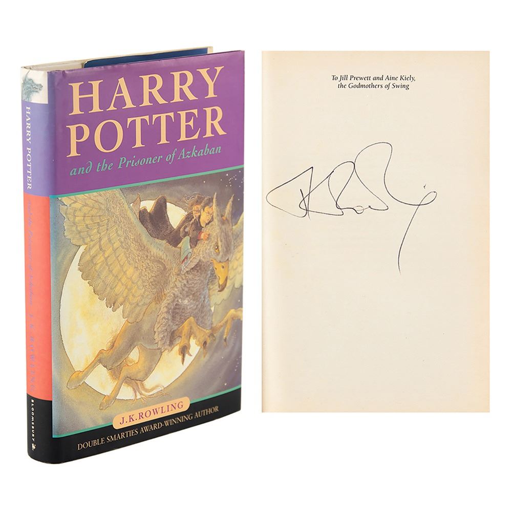 Signed book: Harry Potter and the Prisoner of Azkaban. Second printing. London: Bloomsbury, 1999. Hardcover with dust jacket, 5.5 x 8, 317 pages. Signed on the dedication page in black ballpoint, "J. K. Rowling." Autographic condition: fine. Book condition: VG+/VG, with slight sunning to the jacket's spine. A highly desirable early edition of the third Harry Potter book, nicely signed by its author.