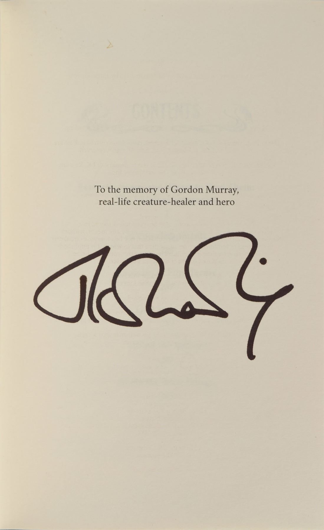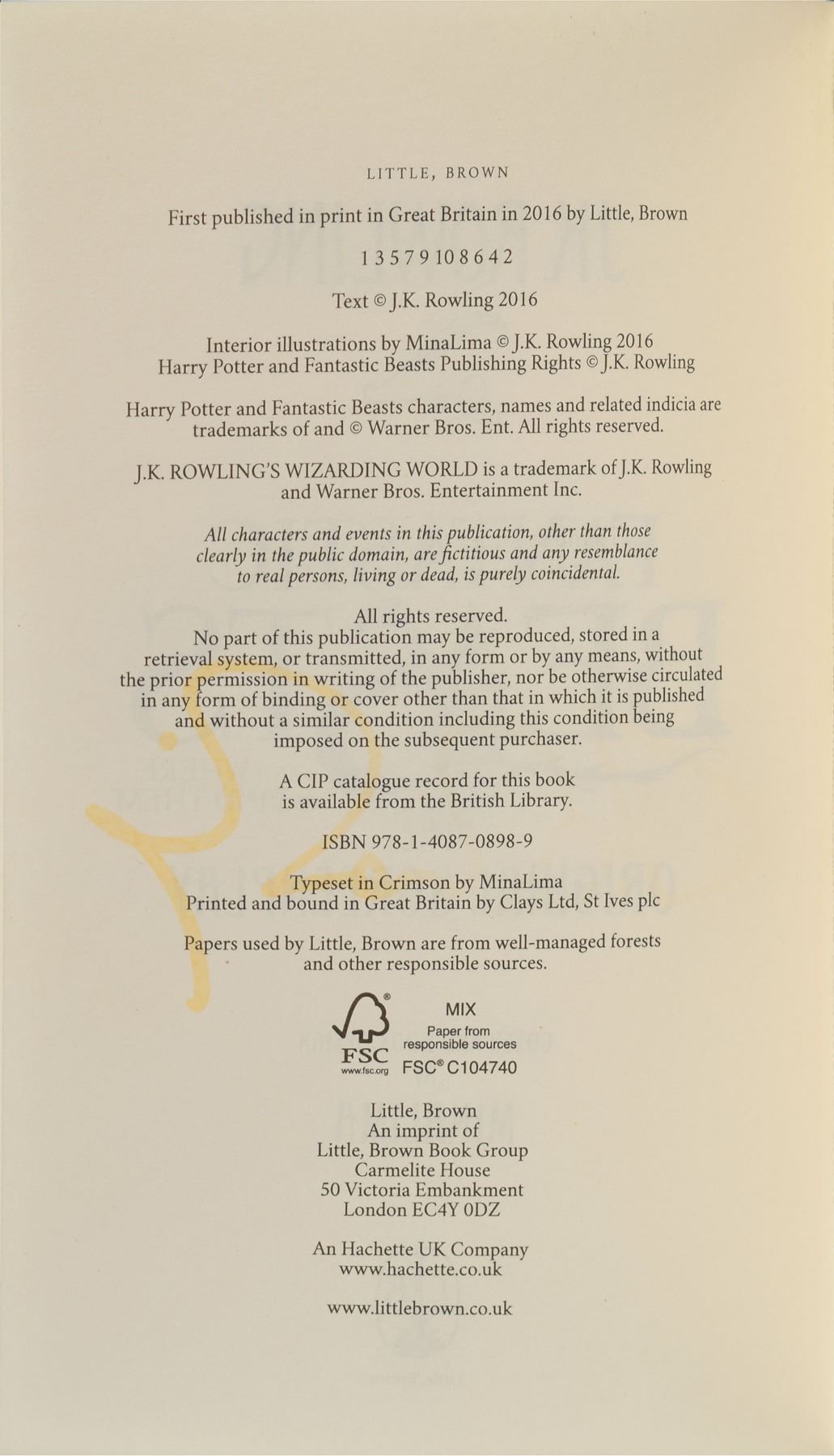 Signed book: Fantastic Beasts and Where to Find Them: The Original Screenplay. First British edition, first printing. London: Little, Brown, 2016. Hardcover with dust jacket, 5.5 x 8.75, 293 pages. Boldly signed on the dedication page in thick black felt tip, "J. K. Rowling." Autographic condition: very fine. Book condition: NF/VG+, with a few spots of adhesive to the front of the dust jacket. Accompanied by a promotional bookmark advertising the book's release.