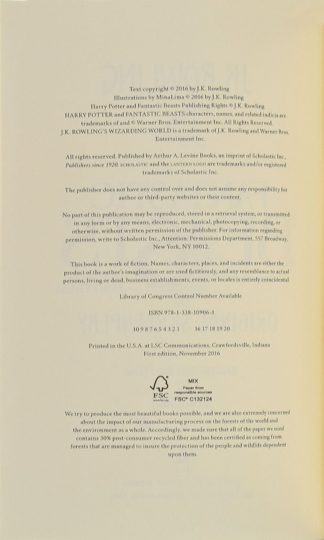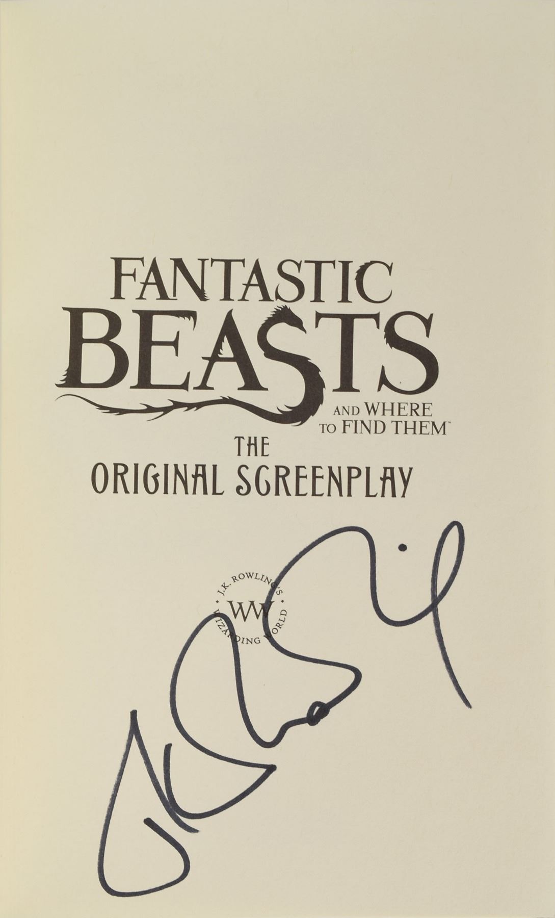 Signed book: Fantastic Beasts and Where to Find Them: The Original Screenplay. First American edition, first printing. NY: Arthur A. Levine Books, 2016. Hardcover with dust jacket, 5.75 x 8.5, 293 pages. Prominently signed on the half-title page in black felt tip, "J. K. Rowling." Autographic condition: very fine. Book condition: NF/NF. Accompanied by a full letter of authenticity from Beckett Authentication Services.