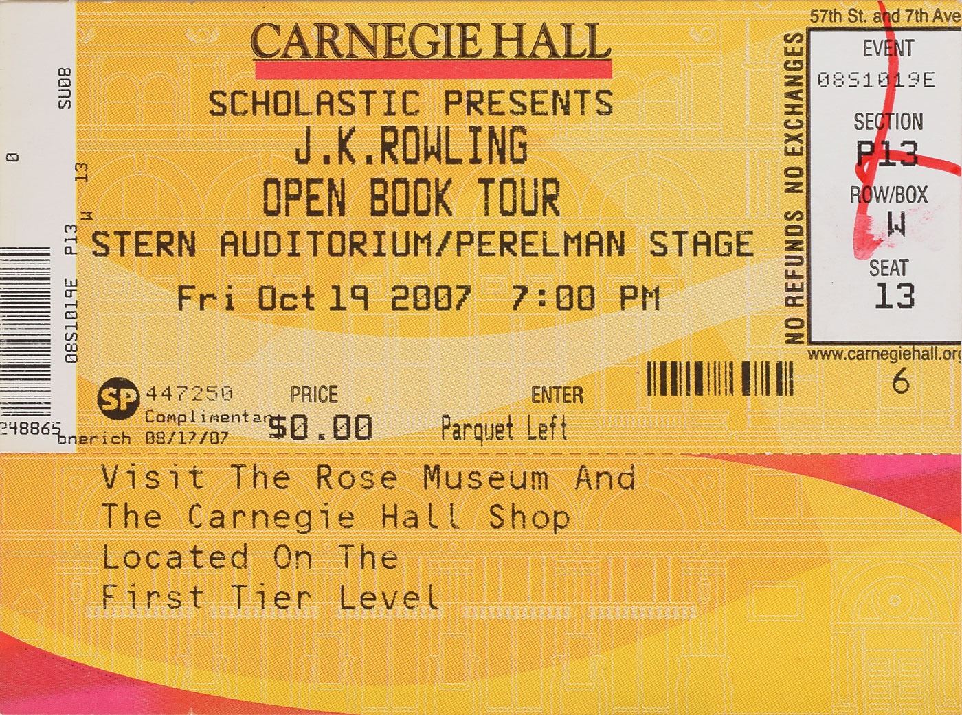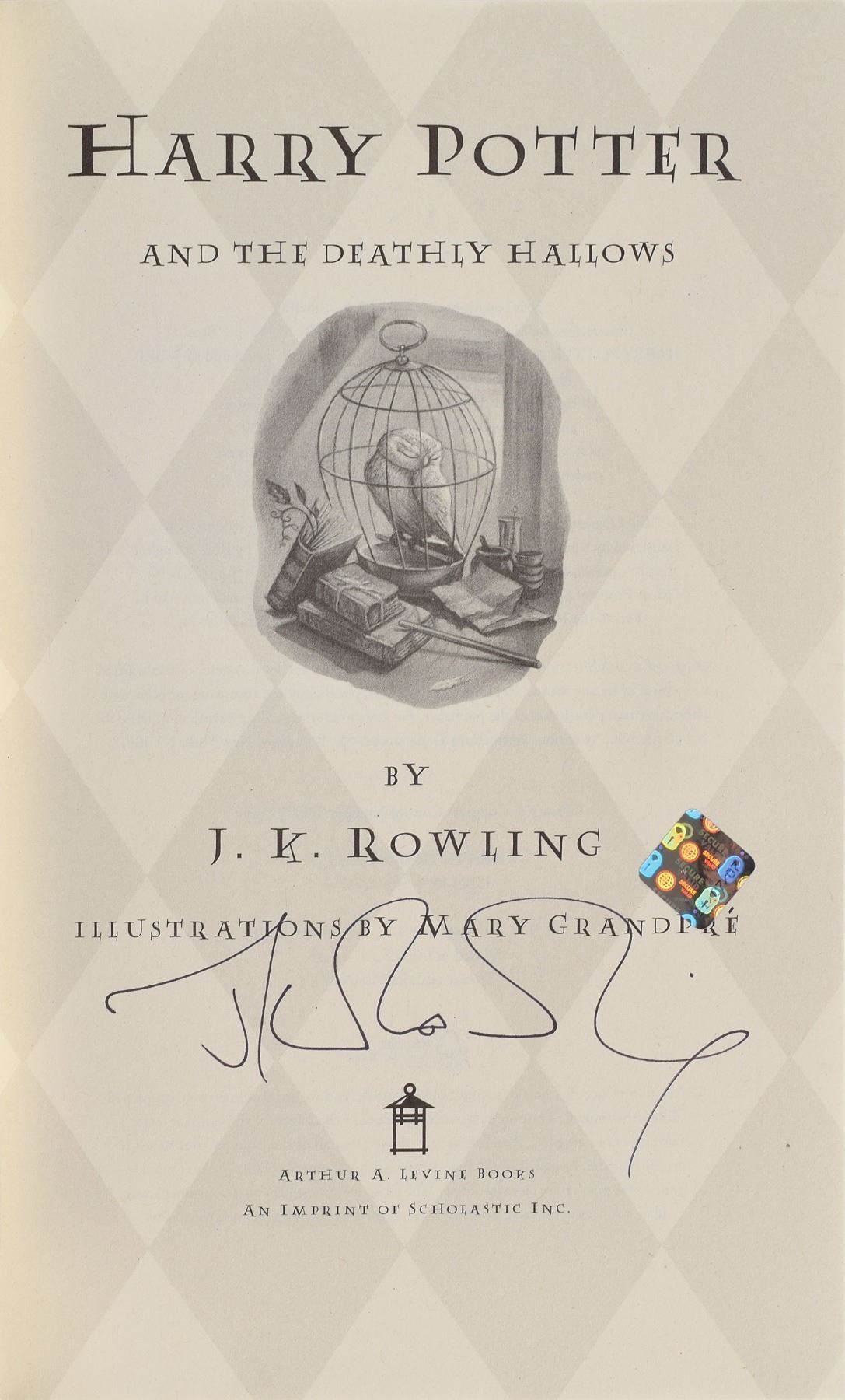Signed book: Harry Potter and the Deathly Hallows. First American Deluxe edition, first printing. NY: Alfred A. Levine Books, 2007. Hardcover with dust jacket and slipcase, 6.25 x 9.25, 759 pages. Signed on the title page in black felt tip, "J. K. Rowling." In fine condition, with a couple of minor dings to the slipcase and an authentication label affixed above the signature. Accompanied by an original ticket stub from the signing at Carnegie Hall during Rowling's book tour on October 19, 2007. A simply beautiful edition boasting an ideal certified Rowling signature.