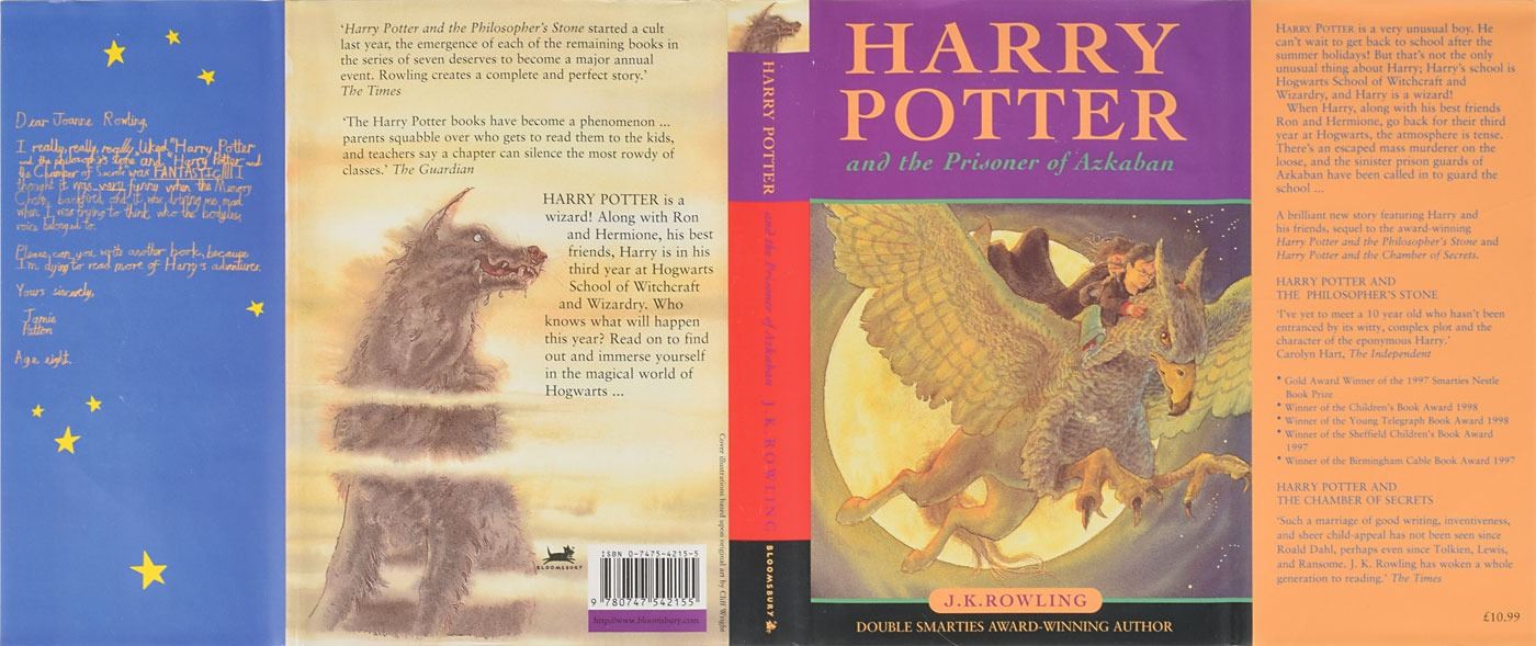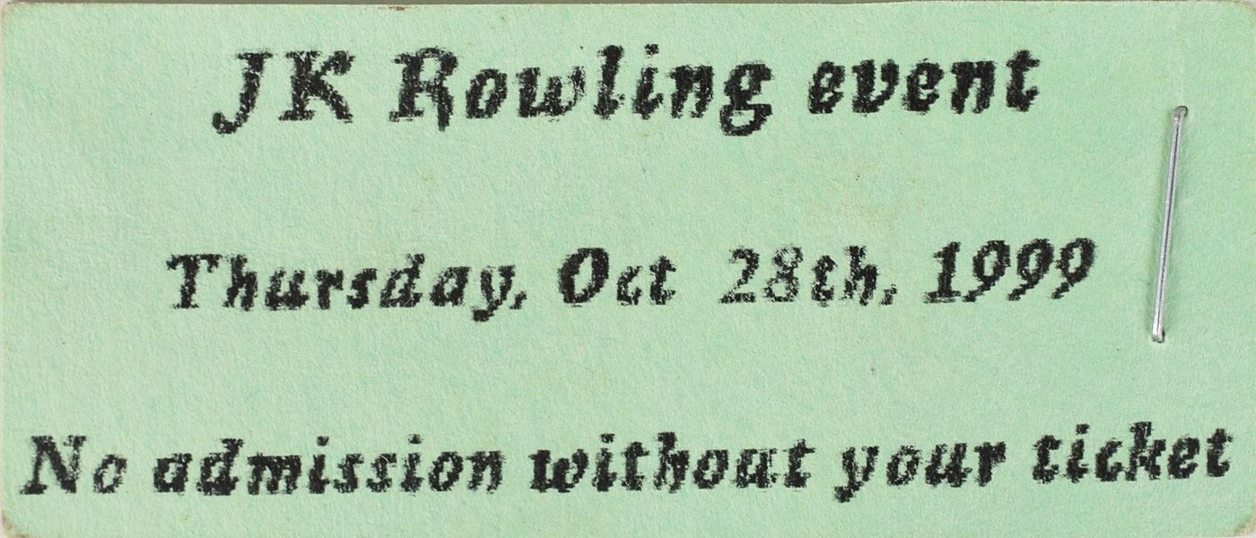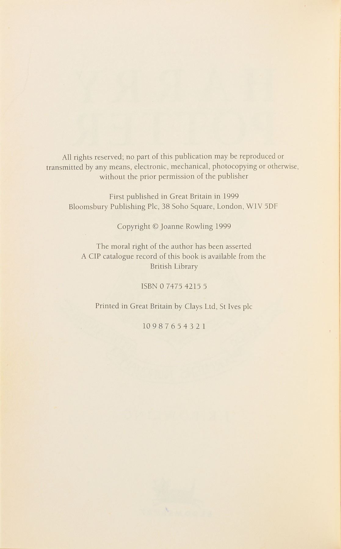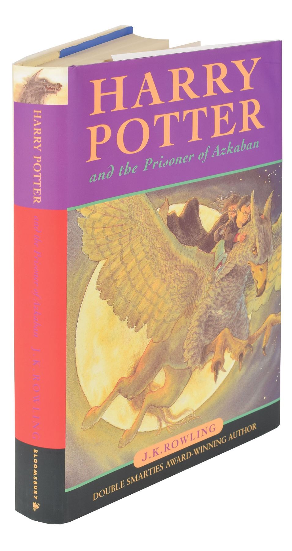 Signed book: Harry Potter and the Prisoner of Azkaban. First edition, first printing. London: Bloomsbury, 1999. Hardcover with dust jacket, 5.25 x 8, 317 pages. Signed and inscribed on the dedication page in blue ballpoint, "To Danielle, with best wishes, J. K. Rowling." In fine condition. Accompanied by a ticket stub for the October 28, 1999, event at which this was signed. The initial hardcover print run was halted mid-printing after it was discovered that "Joanne Rowling" rather than "J. K. Rowling" had made its way onto the copyright page; this is an extremely scarce example from that erroneous first run, made even rarer by the presence of Rowling's signature. Tremendously desirable even in unsigned examples, this is a true treasure for any Harry Potter fan.
