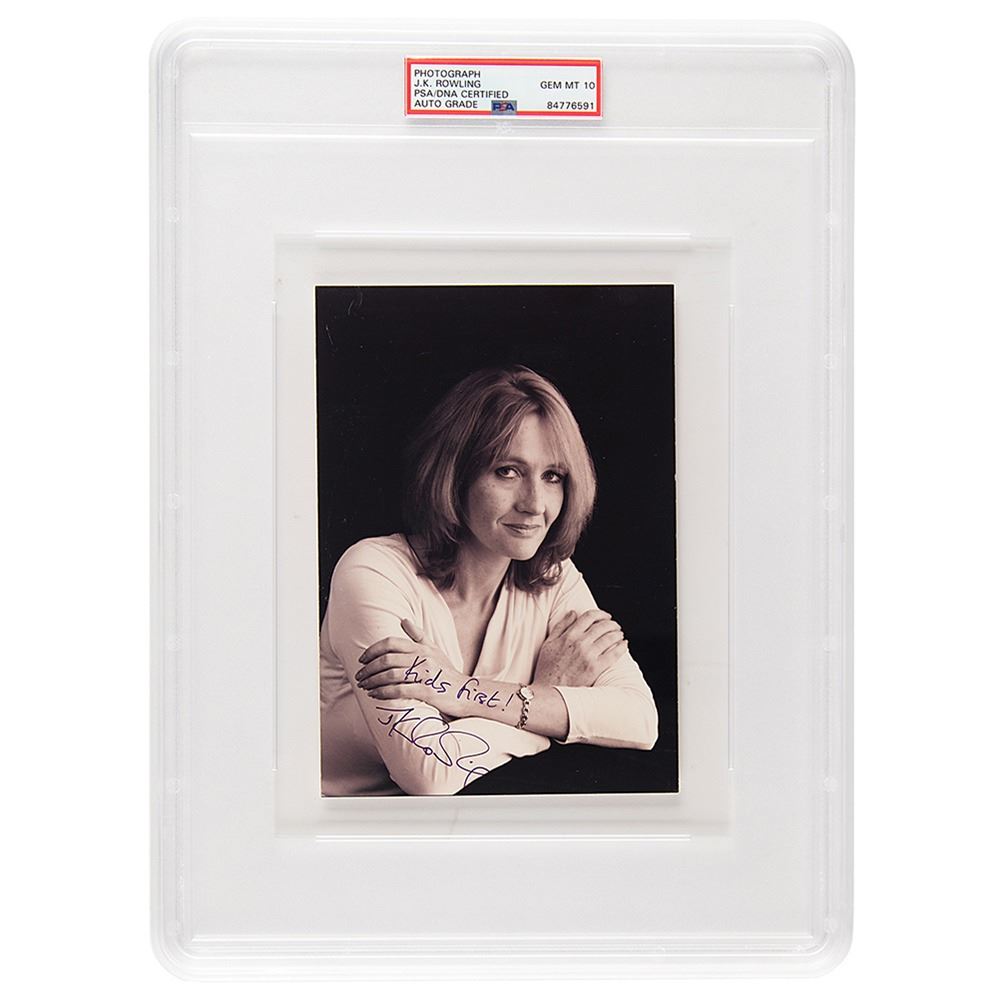 Satin-finish 5 x 7 photo of the popular Harry Potter author in a lovely half-length pose, signed in purple ink, "Kids first! J. K. Rowling." In very good to fine condition, with creasing to the side edges. Encapsulated and graded by PSA/DNA as "GEM MT 10."