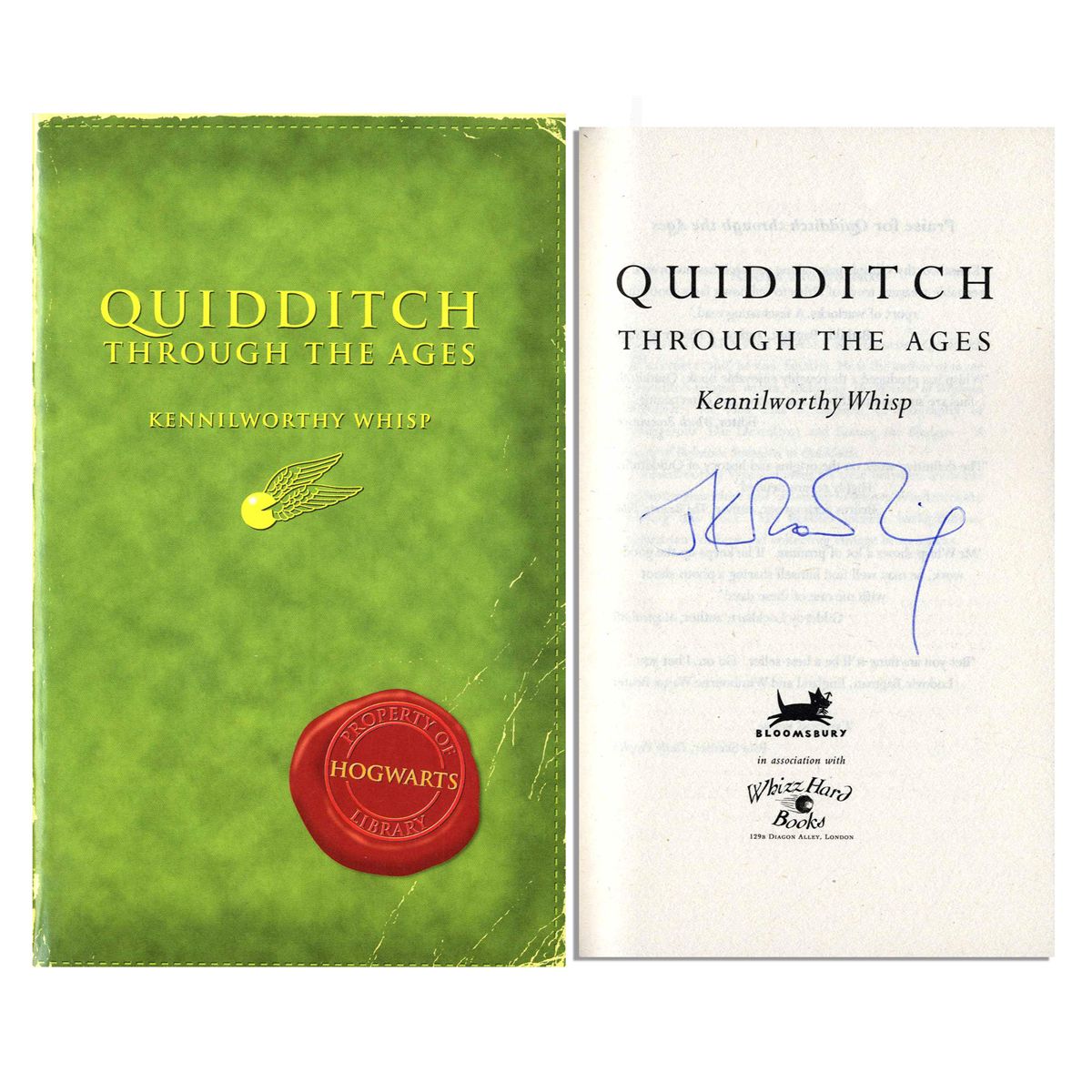 Very scarce Harry Potter book, signed by J.K. Rowling: ''Quidditch Through the Ages.'' Bloomsbury: London: 2001. The author signs upon the title page: ''J.K. Rowling''. The simulated Hogwarts library book is mentioned in several of the Harry Potter novels. Rowling wrote the whimsical book for Comic Relief, a U.K. charity which received this signed copy by Rowlings. Included in the lot is a 29 April 2001 London ''Sunday Times'' describing the contest and a facsimile of the letter to the winner. The 4.25'' x 7'' paperback is in fine condition.