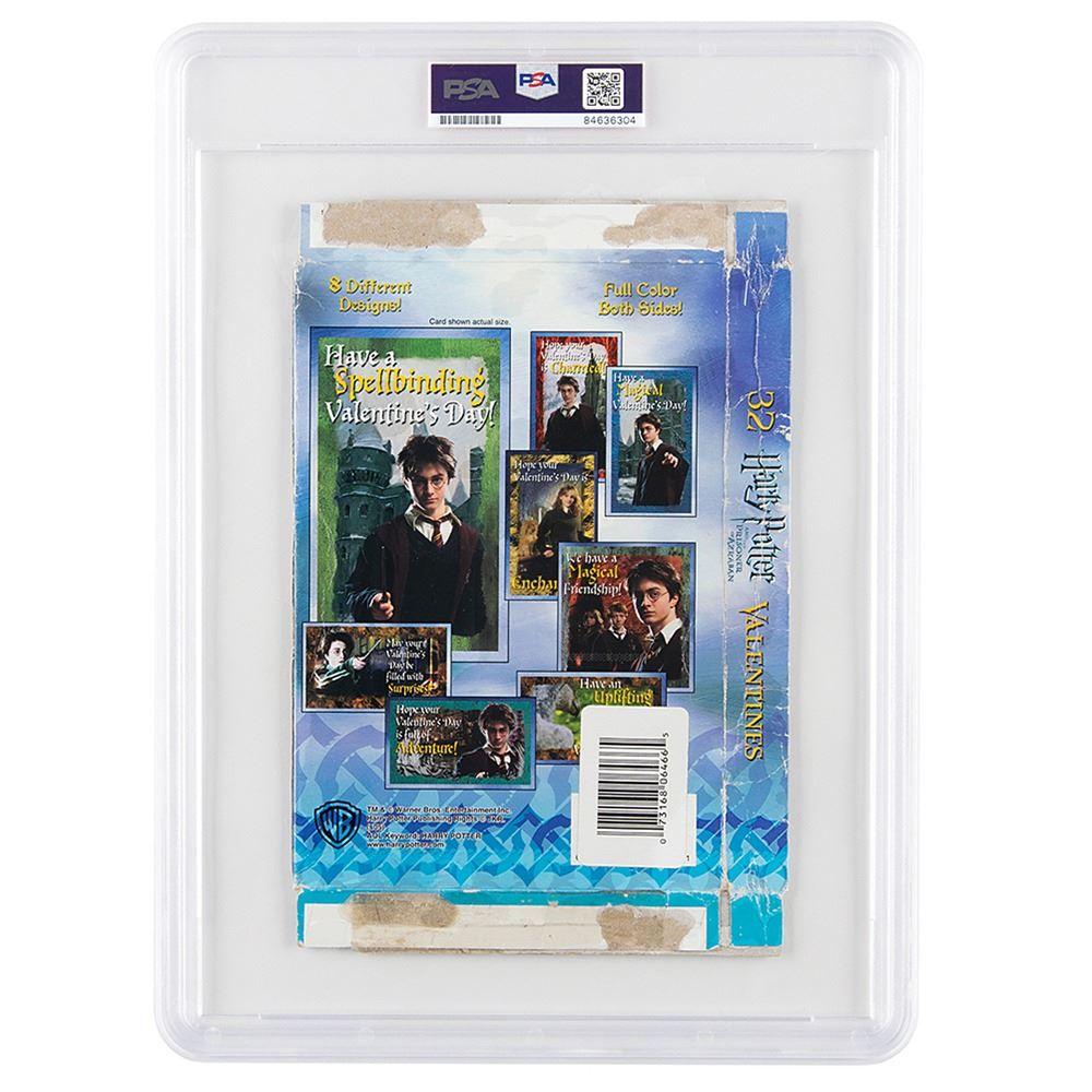 Unusual 6.25 x 9.5 box for Harry Potter–themed Valentine's Day cards, signed on the front in black felt tip by J. K. Rowling. In very good to fine condition, with creasing, primarily to the edges. An intriguing signed format demonstrating the widespread merchandising reach of Rowling's tremendously popular Harry Potter franchise. Encapsulated in a PSA/DNA authentication holder.