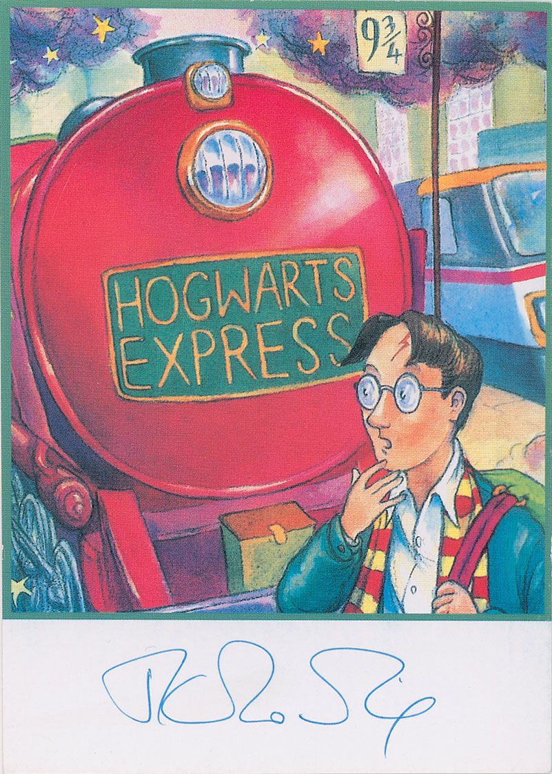 Color 4 x 6 cardstock print of an illustration of Harry Potter standing in front of the Hogwarts Express, signed in the lower border in blue ink. In very fine condition. Accompanied by a 2003 letter from Rowling’s secretary Fiddy Henderson acknowledging the photo as well as the original mailing envelope.