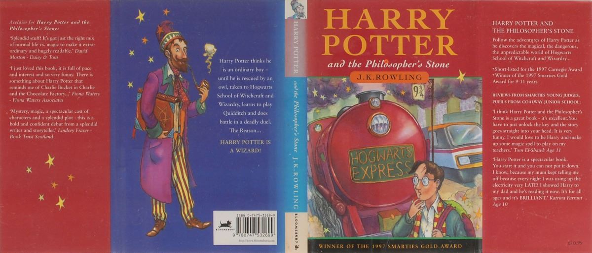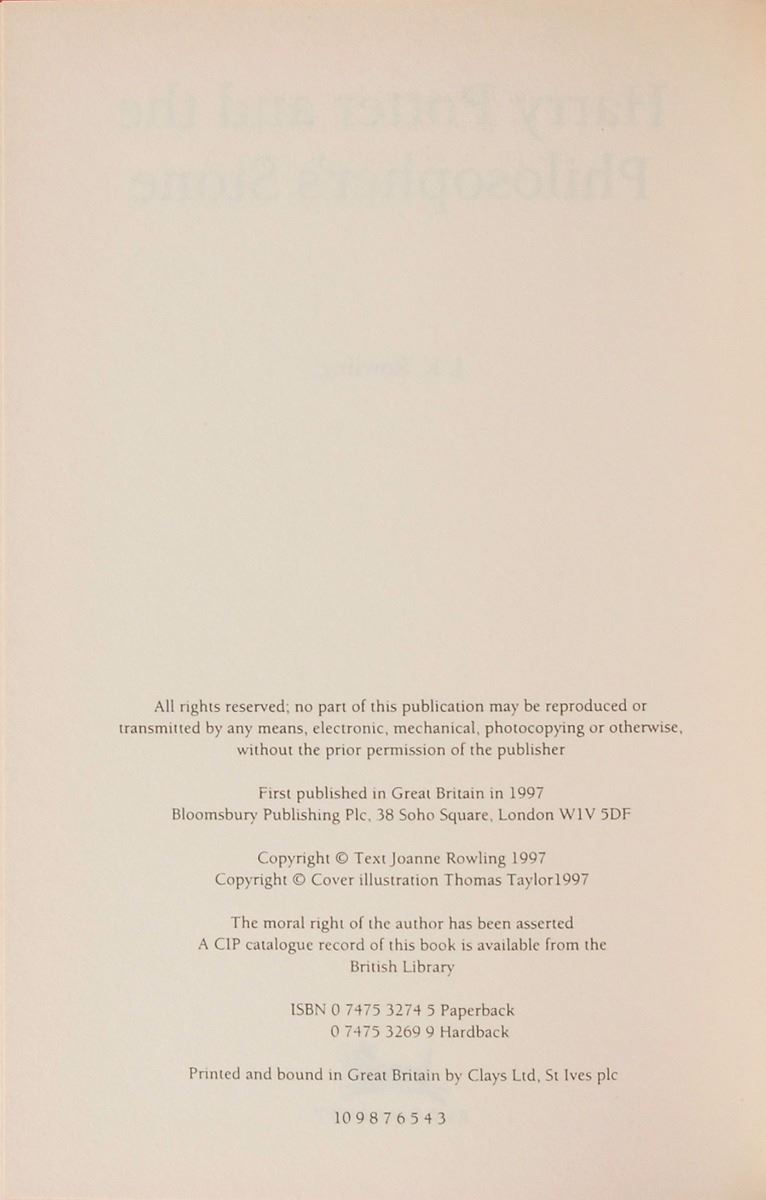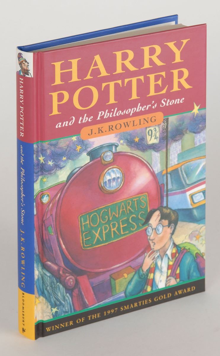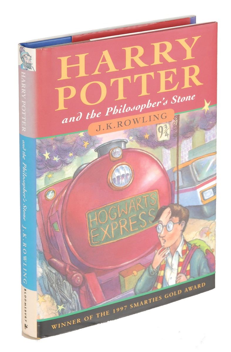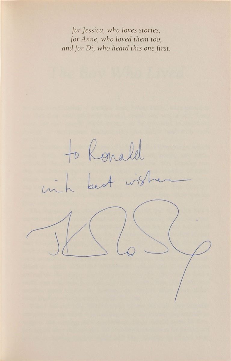 Signed book: Harry Potter and the Philosopher’s Stone. First edition, third printing. London: Bloomsbury, 1997. Hardcover with dust jacket, 5.25 x 8, 223 pages. Signed and inscribed on the dedication page in blue ballpoint, “To Ronald, with best wishes, J. K. Rowling.” In fine condition, with sunning to spine of the dust jacket. The third printing was the first to receive a dust jacket and they are rarely found in signed examples.
