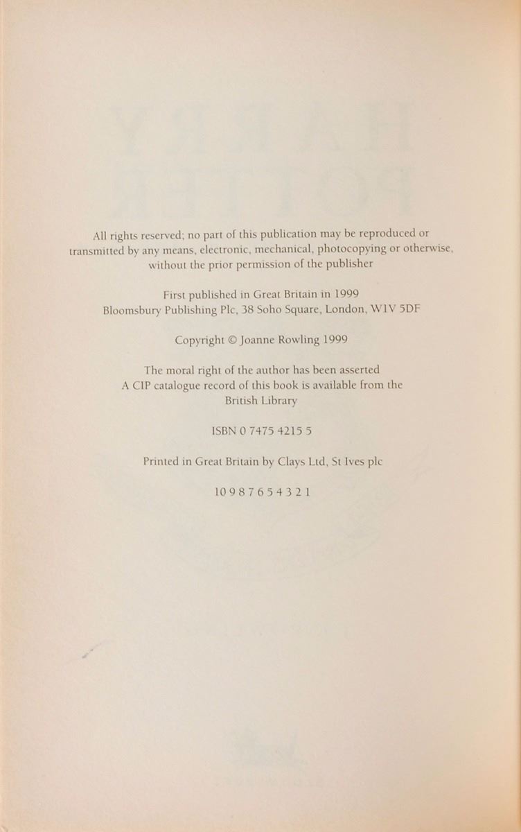 Signed book: Harry Potter and the Prisoner of Azkaban. First edition, first printing. London: Bloomsbury, 1999. Hardcover with dust jacket, 5.25 x 8, 317 pages. Signed on the dedication page in black ballpoint, “Happy Birthday! J. K. Rowling.” In fine condition, with light toning along the edges of the pages. The initial hardcover print run was halted mid-printing after it was discovered that “Joanne Rowling” rather than “J. K. Rowling” had made its way onto the copyright page; this is an extremely scarce example from that erroneous first run, made even rarer by the presence of Rowling’s signature. Tremendously desirable even in unsigned examples, this is a true treasure for any Harry Potter fan.
